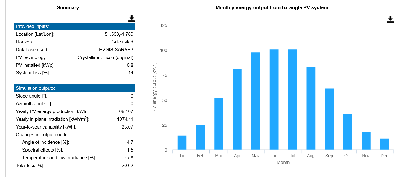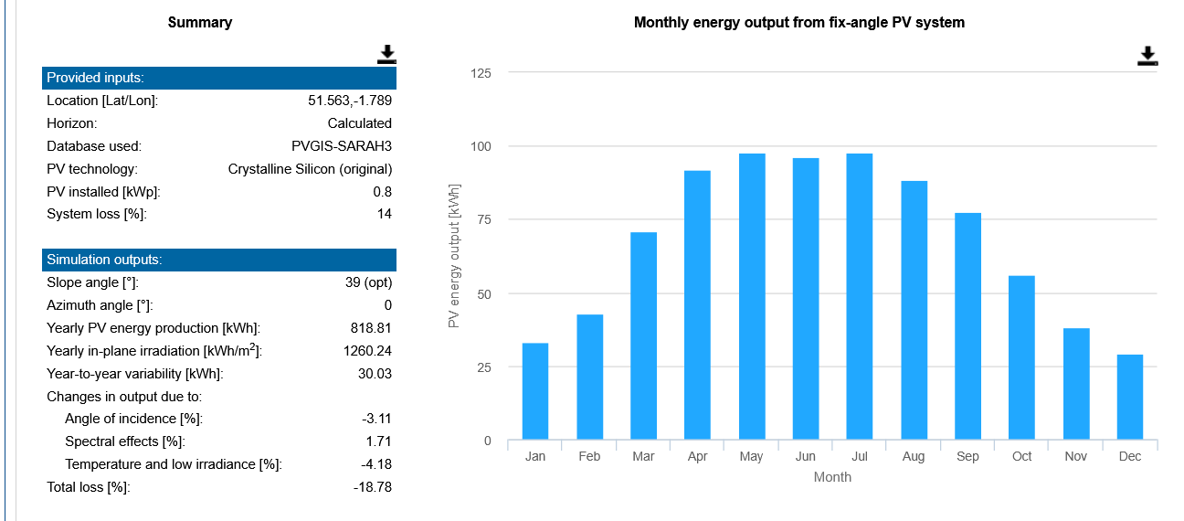 The PVGIS model is free for anyone to use, so if you want to try adjusting settings (eg. if you don't live in Swindon) please give it a whirl!