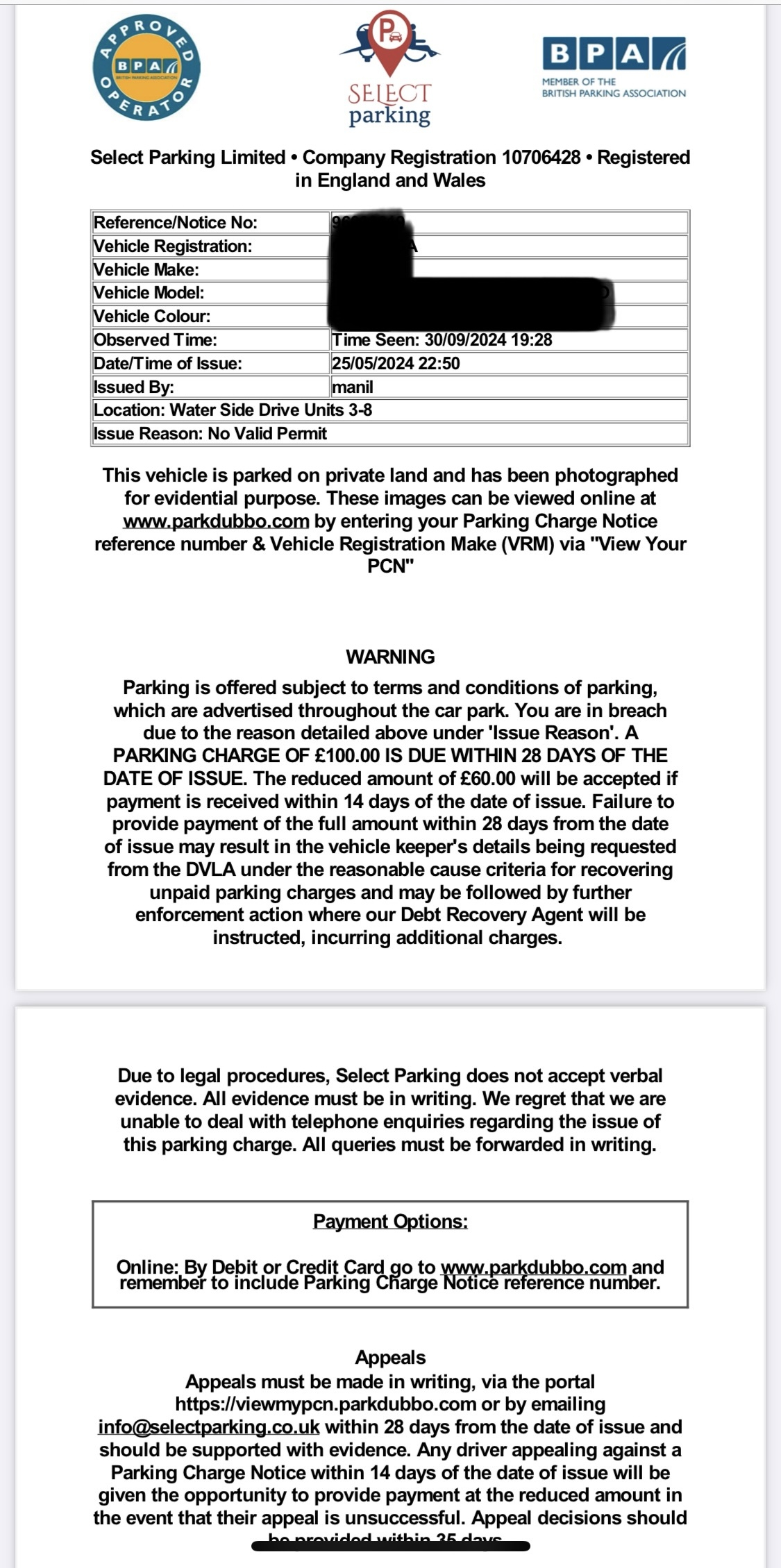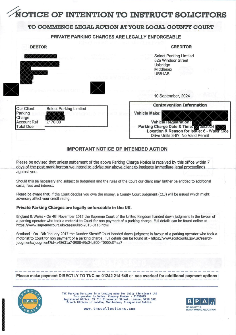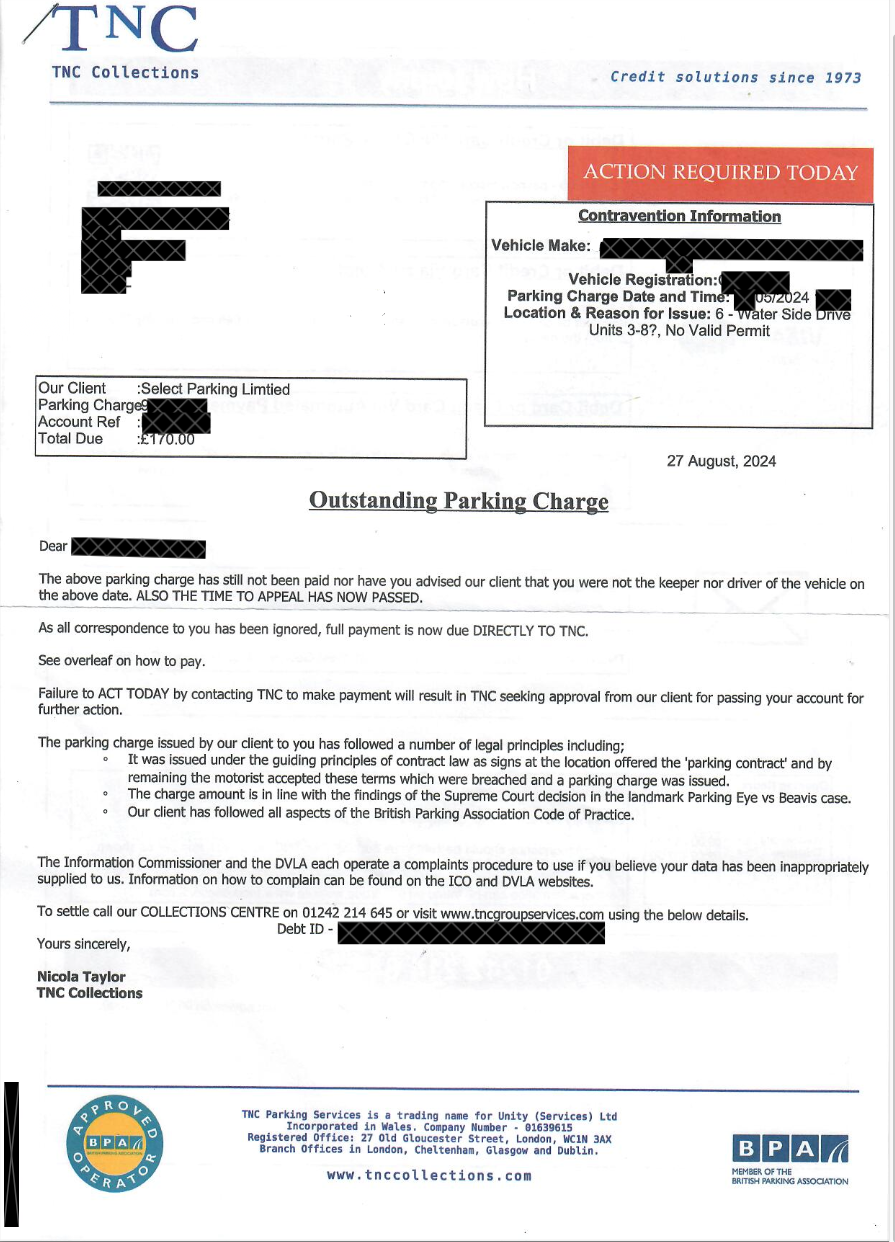 I’m facing a similar situation with Select Parking. I received two letter about two infractions in early May, but I never received any PCN letters—just outstanding charge notices from TNC debt collectors, dated August 29th (three months later!). This notice informed me that the appeal period for these infractions had already passed. I also received a Notice of Intention to Instruct Solicitors on September 10th.Last week, I sent the “newbie” letter to both TNC and Select Parking Ltd. I received a response from TNC via email on Monday, September 13th, with two photos related to the first infraction. The first photo shows the car entering the parking lot, and the second shows it leaving, but neither includes a picture of the car parked in a space. The email did include the location, date, and time of the alleged infraction. I’ve also requested details regarding the second infraction but haven’t received anything yet.Should I appeal to POPLA? Any advice would be greatly appreciated.0