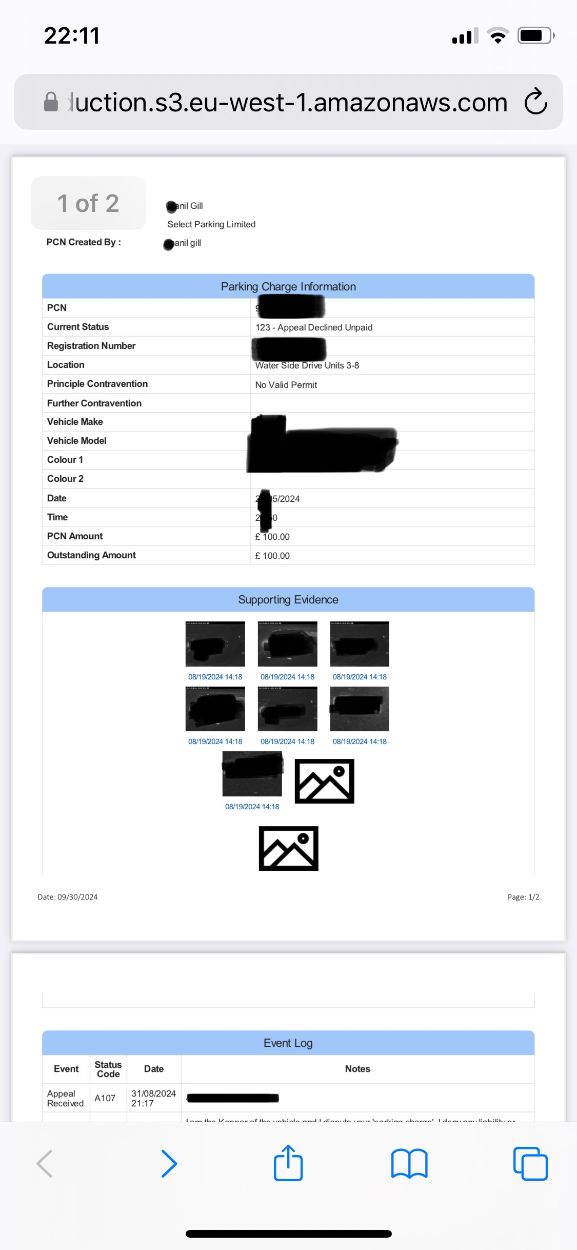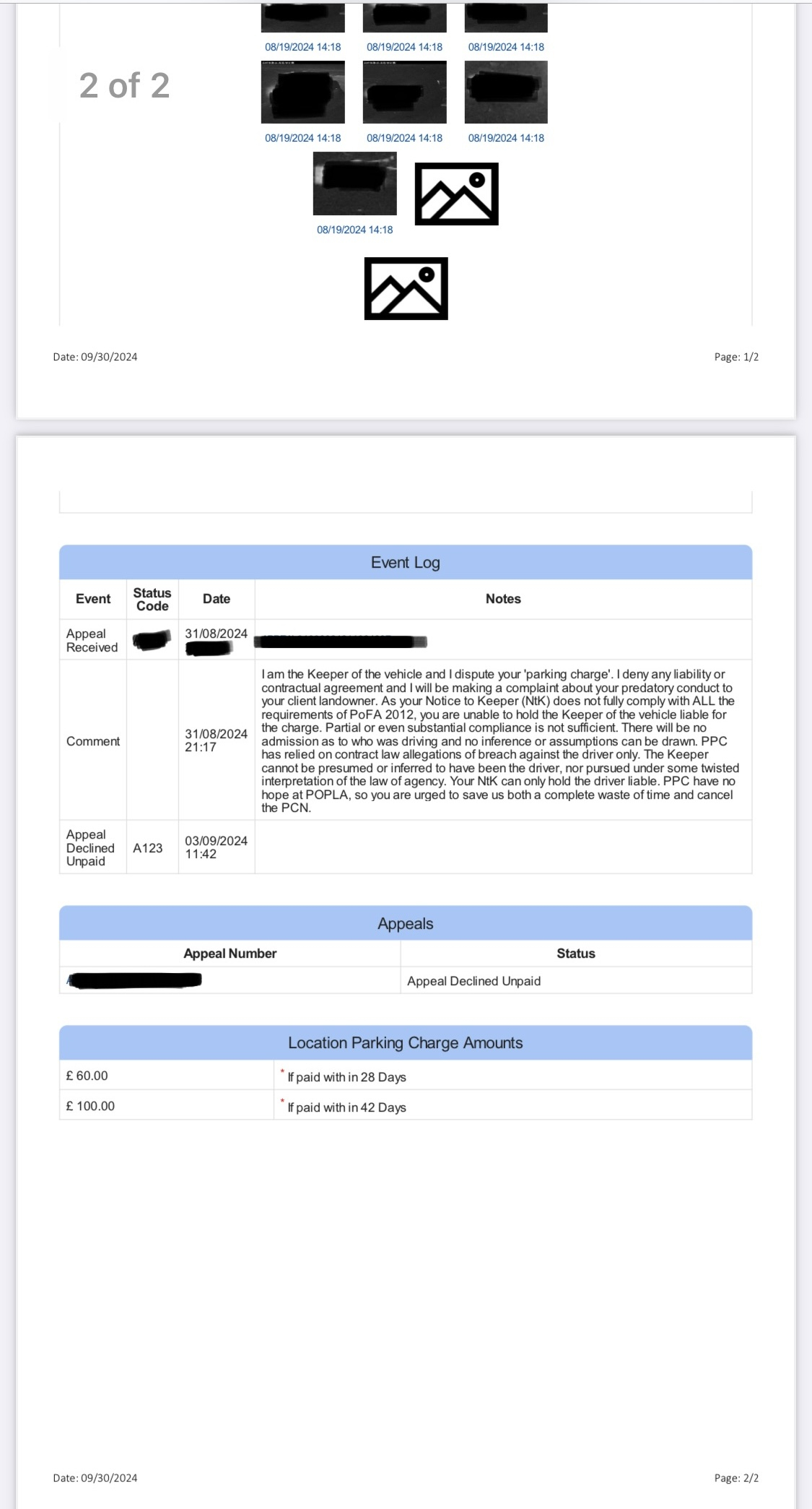 Attached document 8: Select Parking Ltd’s appeal to Popla it looks like, stating appeal declined (image below with blue headers).