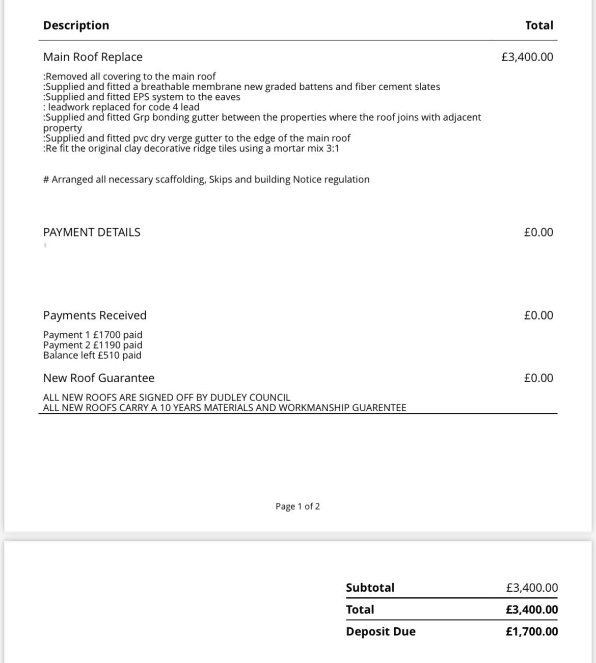 I have had an air vent fall off my roof, causing an open area to the loft. The previous owner of the house had a new roof completed in 2019. On the documentation I received from my solicitor when buying this house the roof documentation was included, stating a 10 year warrantee. This is the invoice.
