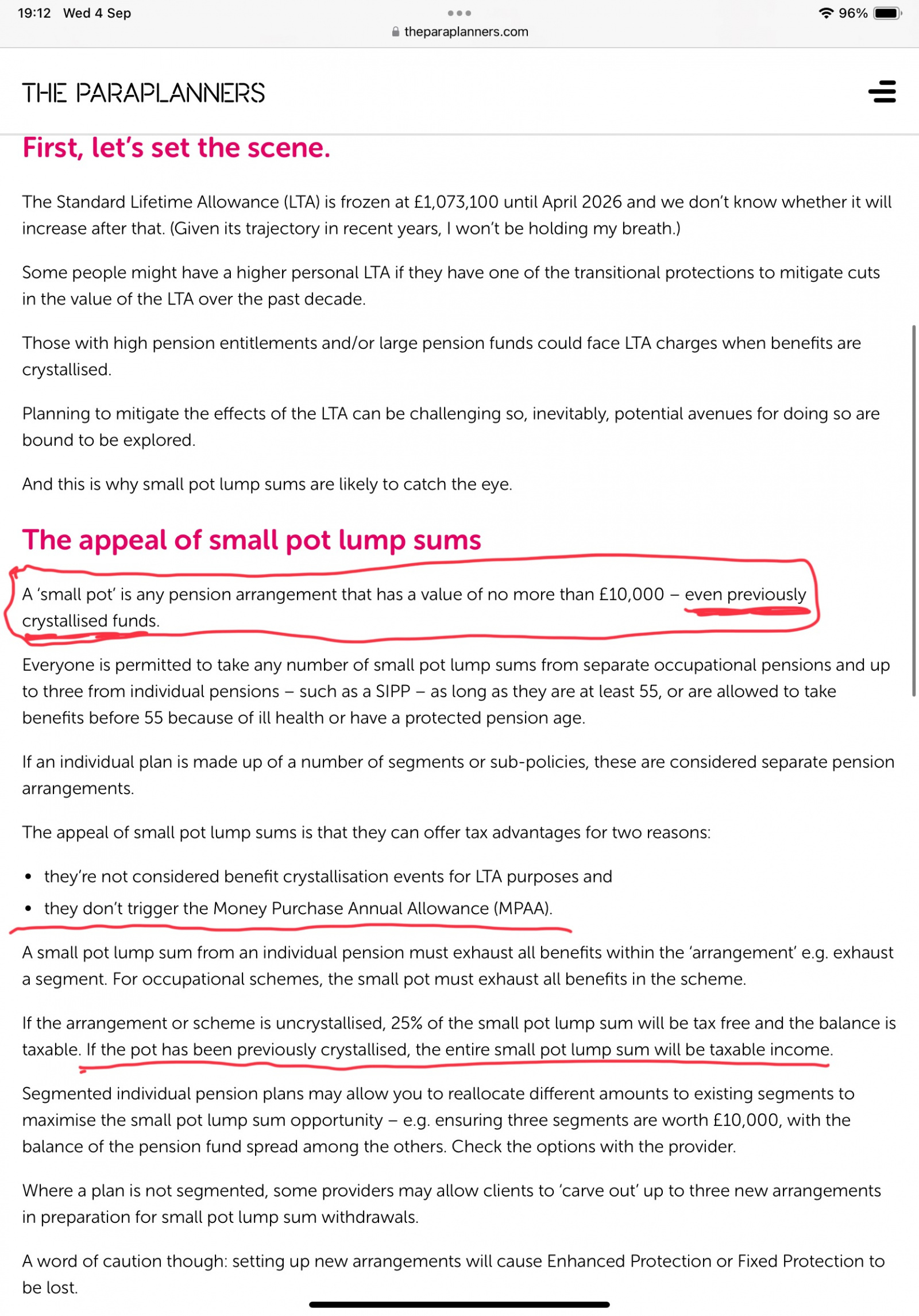 Just wanted to point out that another advantage of taking a small pot ( although it will affect less people than the MPAA point) is that previously it had no impact on your LTA %, and nowadays it has no impact on your Lump Sum Allowance. So the 25% tax free from the small pot is not included in the maximum tax free amount you can take from pensions.3 -