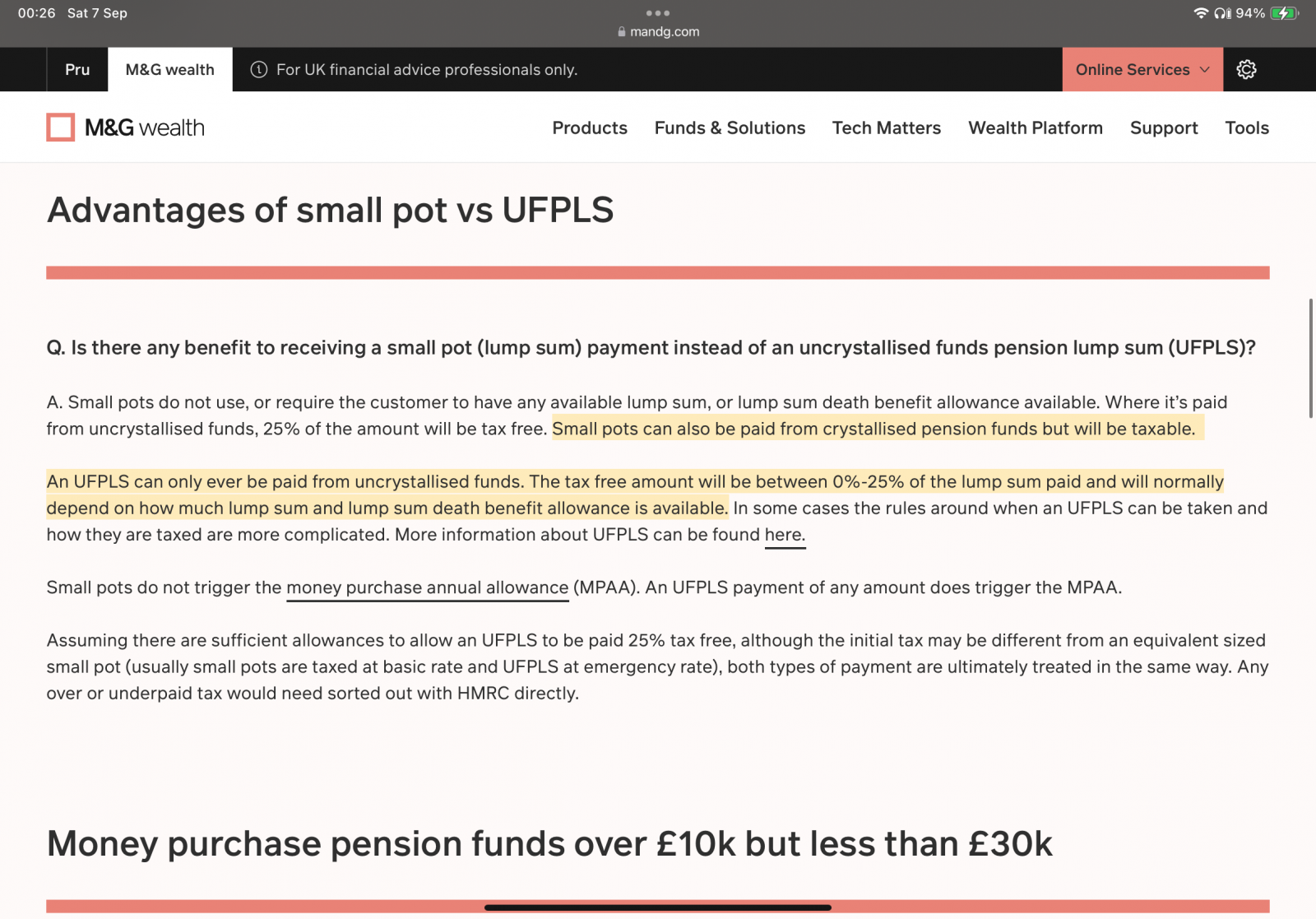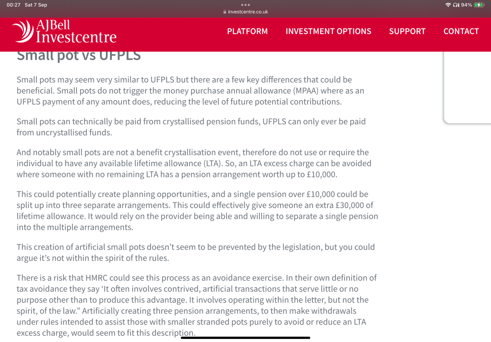 It's both interesting and confusing. I also spoke to AJ Bell who said it couldn't be done from crystallized funds, it would be income and trigger the MPAA. I might go back to them and ask why their phone advice contradicts their website! Is that a dig I spy, at pension providers who are happy to split a pension to create three 'artificial' small pots (AJ Bell won't do that) 😄FIREDreamer said:Not trying to be controversial, but it seems like other providers suggest it’s possible to take small pots from crystallised pensions, three examples …