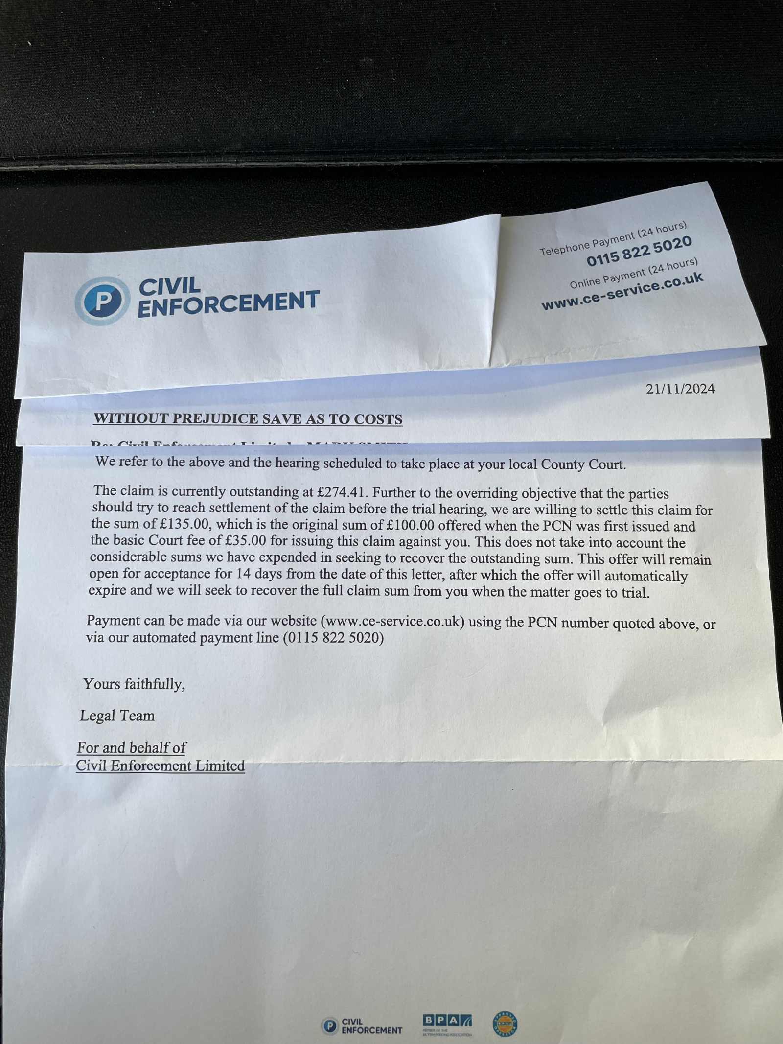 In today's post I got a letter from Civil Enforcement - Without Prejudice Save as to Costs