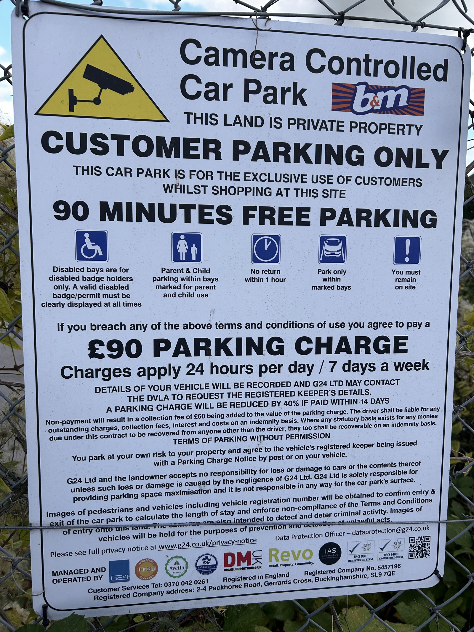 I was told today that B&M own the site but all enquiries regarding parking are to be administered via G24. The staff member did seem very apologetic, but had no authority.My feeling is that whilst it is surely possible for the land owner (B&M - not verified yet) to cancel an alleged private parking charge, one must find a way to actually convince them to operate outside of an agreed money making scheme.I cannot imagine for one minute that B&M and other such retailers are not complicit in this scheme, no doubt arguing that it was necessary to safeguard the parking area for its own customers.Anyway, I am not coming with anything new here, but thought I would just add the update for reference.3