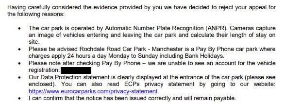 All was good, few weeks later received PCN stating "No valid pay and display/permit was purchased", which I appealed, got the below response: