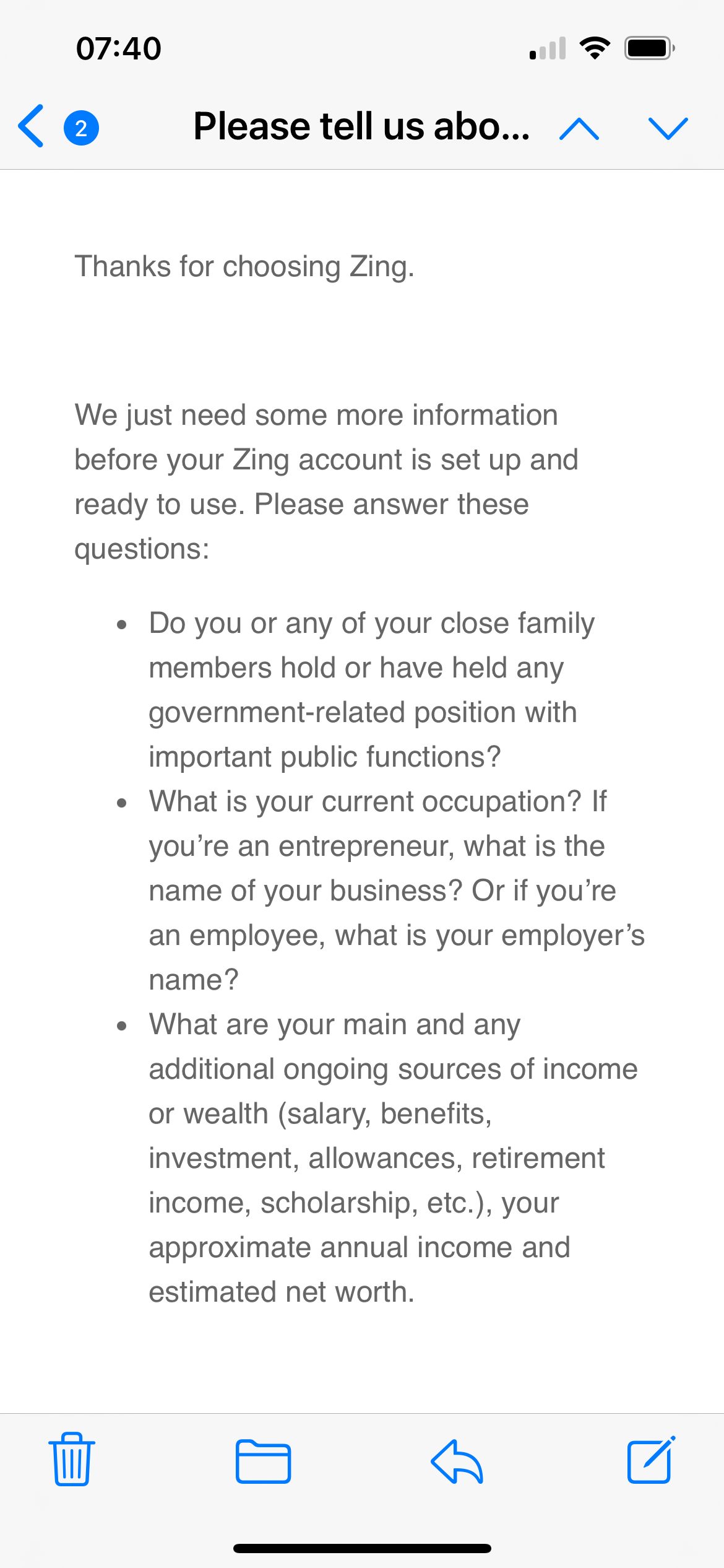 Has anyone received an email from Zing asking for information in order to set up the account?