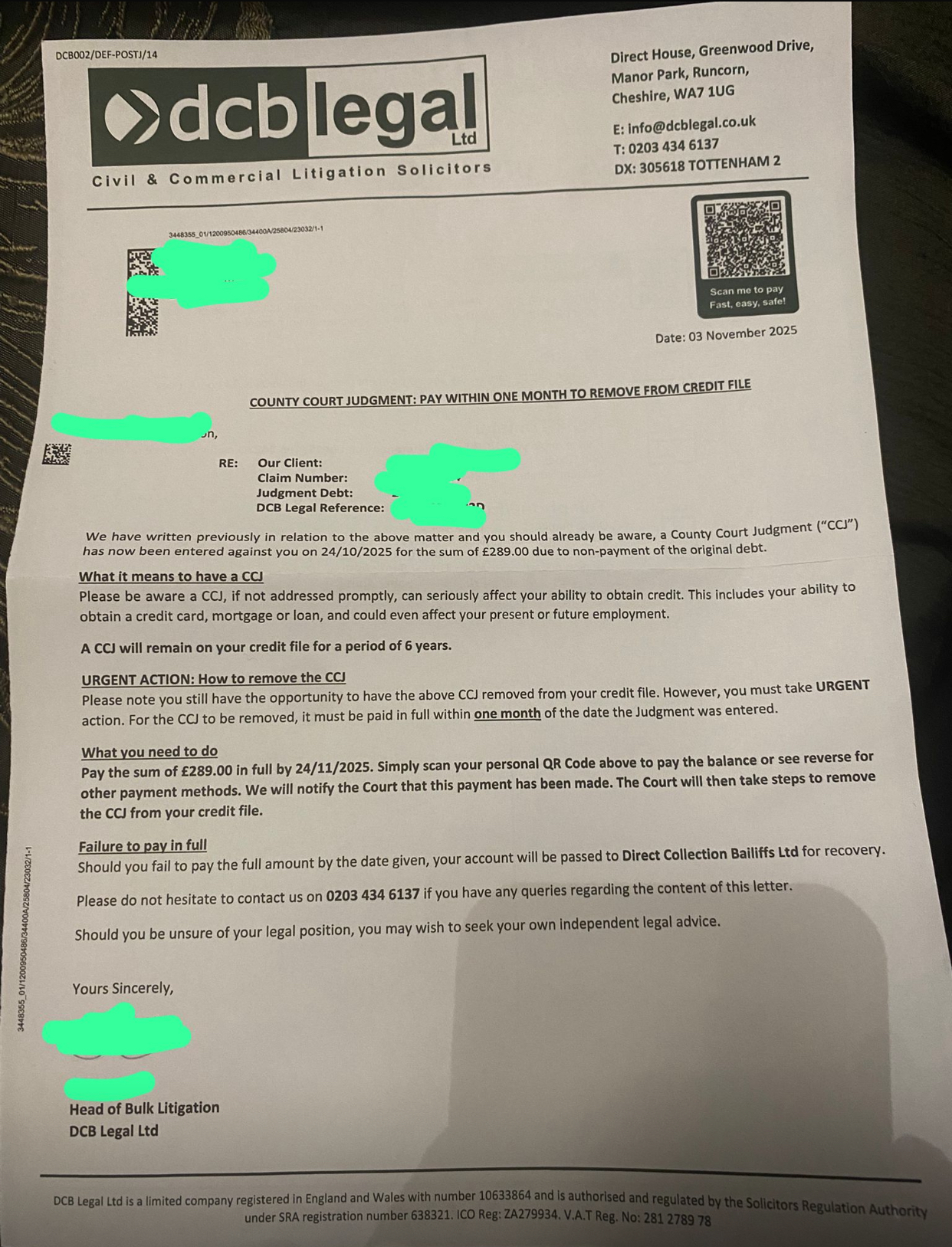 I’ve drafted my response to DCP legal below. Can you please advise if there are any further actions that I should take and whether I should follow up with HMCTS as well?Subject: CCJ Dispute – Request to Pause Action Pending HMCTS InvestigationTo: info@dcblegal.co.ukDear DCB Legal Team,I’m writing in relation to your letter dated 3rd November 2025 regarding the County Court Judgment (CCJ) for £289.00 on case reference (blank) concerning I Park Services Ltd.Please be advised that I lodged a formal complaint with HM Courts & Tribunals Service (HMCTS) on 27 October 2025, reference (blank) which is currently under investigation by their National Services Complaints Team.Given that the matter is being reviewed by HMCTS, I respectfully request that all recovery, enforcement, or payment action be paused until their investigation is fully concluded and a final decision has been issued.