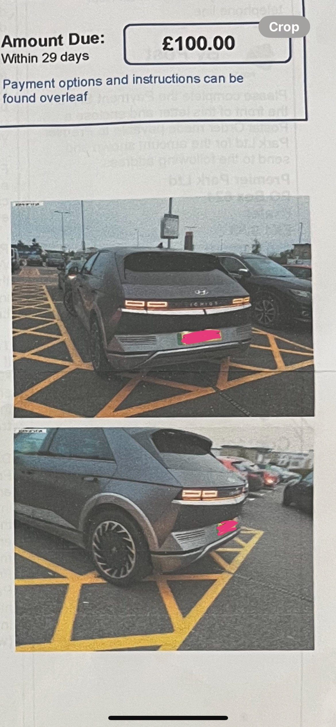 Hi, my mum recently received a ticket from a private car park saying she is "not wholly parked within bay" but in both the pictures they sent the cars brake lights are still on and there is obviously still someone in there as it is unlocked. I am not sure what to say to them to get it dropped as it seems a bit ridiculous anyway. They have given us 14 days to pay £60 or after that £100. I have attached a picture that they sent us too.