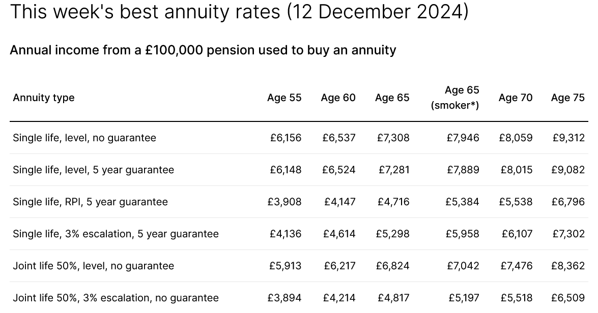 Dazed_and_C0nfused said:Have you checked possible annuity options, I might be a bit out of touch but an inflation linked annuity paying £10k from a £150k pension fund sounds a bit on the high side, even if inflation proofing was fixed/limited to say 2-3%.Current HL best buy table here:£150k at age 65 would buy ~£10900 level, ~£7900 esc. at 3% or ~£7100 linked to RPI. That's single life; joint would be less.4% drawdown would get you £6000.N. Hampshire, he/him. Octopus Intelligent Go elec & Tracker gas / Vodafone BB / iD mobile. Ripple Kirk Hill Coop member.Ofgem cap table, Ofgem cap explainer. Economy 7 cap explainer. Gas vs E7 vs peak elec heating costs, Best kettle!