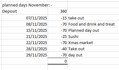 I am on £1286.27/ £600 which is 214% utilised, I am on 15/12 No spend days, there is 0 days left of the month and therefore it is pay day!. I have £2000/£3500 EF which is 57%, it looks like once the lodger has paid I will be able to add £1000 as I have had a tax break. Making it 85% of the way there only leaving £500 to save for next month, which is doable. I also have for tomorrow £700 in the pot for spending starting Tomorrow on the 1st November. I have gone ahead and planned all spends which there is plenty of opportunity to splash the cash and enjoy the month, also so I am organised and not go over budget. Enjoy your day allXX1