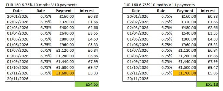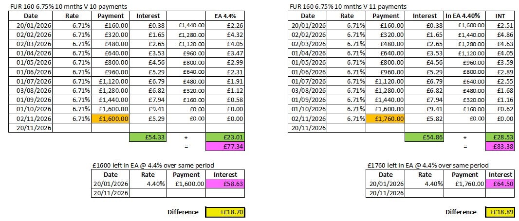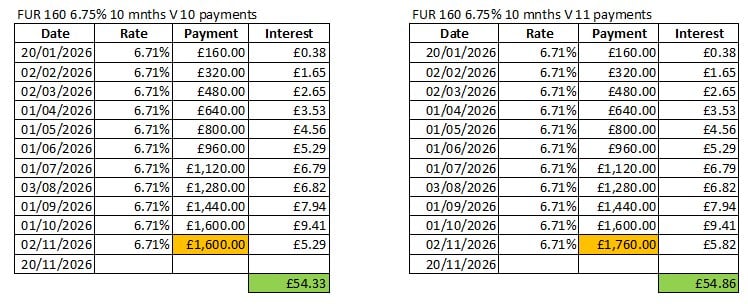 Or I'd just say £160 at 6.75% for 18 days =53p (as your table shows)Bobblehat said:Here are the rough figures for funding 10 payments or 11 payments