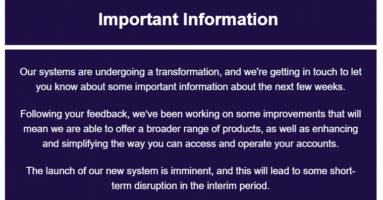 They're using a brand new platform meaning everyone has to now set up brand new log in details. From what I've seen on the new platform, this change also seems to have affected the actual account number. As discussed previously, the account number for the old system was XXX1234567XXX where the first three letters denoted the account name (i.e. ARG for Adcock Regular), 7 digits of your account number and the three last letters denoted the first three letters of your surname (i.e. PHL for Phlakes).