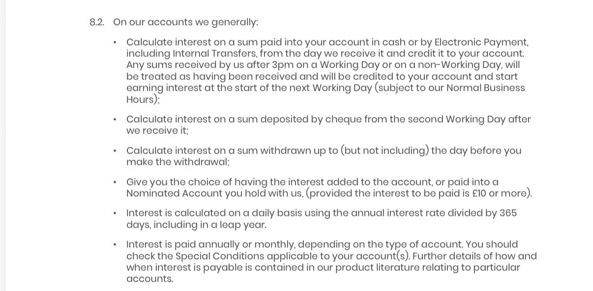 Taken from Skipton BS, maybe typical "Interest from debit card payments will start to accrue on the second working day after the deposit was made"Growingold said: