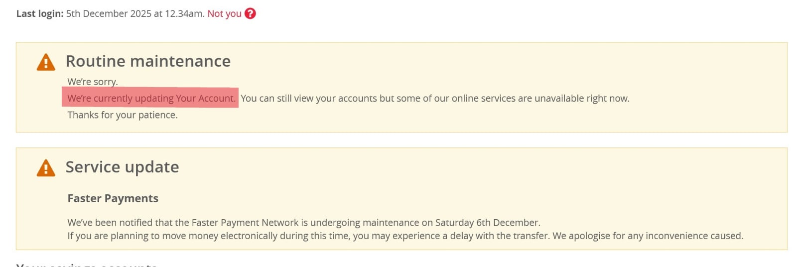 Just logged into Principality and find a routine maintenance with regards to updating my account. I'm wondering if Principality BS are closing the loophole for future maturity instructions for the same RS / Bond Issue being available as a maturity option? Interesting, because I've never seen Principality undertake this type of maintenance.I had an issue 3 6 month RS mature today which was converted into another issue 4. However, I also noticed late last night that I had a missed call from Principality BS on Thursday morning, but my maturity instructions were still actioned, this time. I might not be so fortunate with a couple of PBS RS maturing in January......It will be interesting to see if anyone else experiences issues with future maturity instructions not being actioned due to already holding a certain RS / Saving issue number. We can but hope for everyone's sake......~ NSD 2025 - NSD December 5/20 (11 x💯)# Spectos/Royal Mail Monitoring and Posting Panel - On Rest - 2 x £25 Vouchers Redeemed, 29 FREE Books of RM Stamps & 2 x Presentation Pack.~ Totally FREE Christmas 2025 - 🎁✉️🏷🎀💐🪪🗒🧺⭐️Completed Challenges 2025:# No.36 Make £2025 in 2025 £1756.28 / £2025 (4) 💯💯💯# No.12 Save £2 a Day 2025 £730/ £730 💯# No.27 Save 1p A Day 2025 £667.95 / £667.95 💯# No.19 52 Week Env Challenge £1378 / £1378 💯# No.34 Save £12k in 2025 £22,375.08 / £12,000 💯 (12) - Completed2 -
