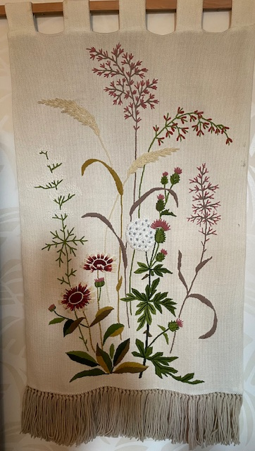 Not so much vintage clothing and not so much decluttering - although I have given this to my only niece as she was named after her grandmother who made this is the early 60s when her daughter (my beloved DM) moved to Scotland from Germany. The thistles are especially poignant.After the photo was taken I had it restored at the The Royal School of Needlework before sending it off to Australia. My mother cherished this as did I, however it was best to pass it on as my wee stone cottage would have been the death of it. I have so many items which my grandmother stitched, from pulled thread table clothes to fully embroidered ones to initials on damask napkins.