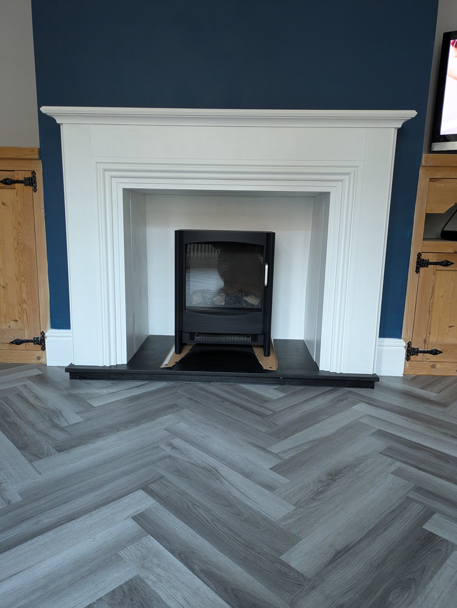 my new fire surround was fitted today.I am so excited. It is so beautiful and made especially to my requirements. The mouldings exactly match the door and window frames. I just need to get some soft things to stick on the bottom of the fire so that it doesn't scratch the hearth. I am such a a lucky girl. It cost £200 less than the original one that I ordered and that's without the additional £345.00 that they wanted at the last minute to transport it to the Isle of Wight. It's stunning.