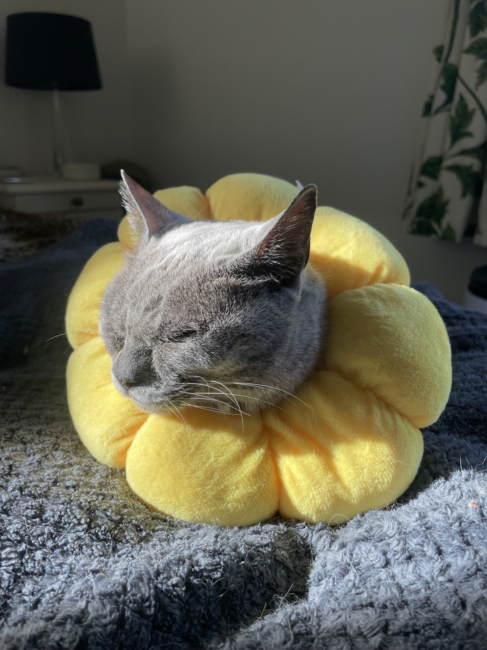 @Green_hopeful and your gray panther is lovely too, such a sweet face nicely framed in her daisy! Hope she feels better soon.