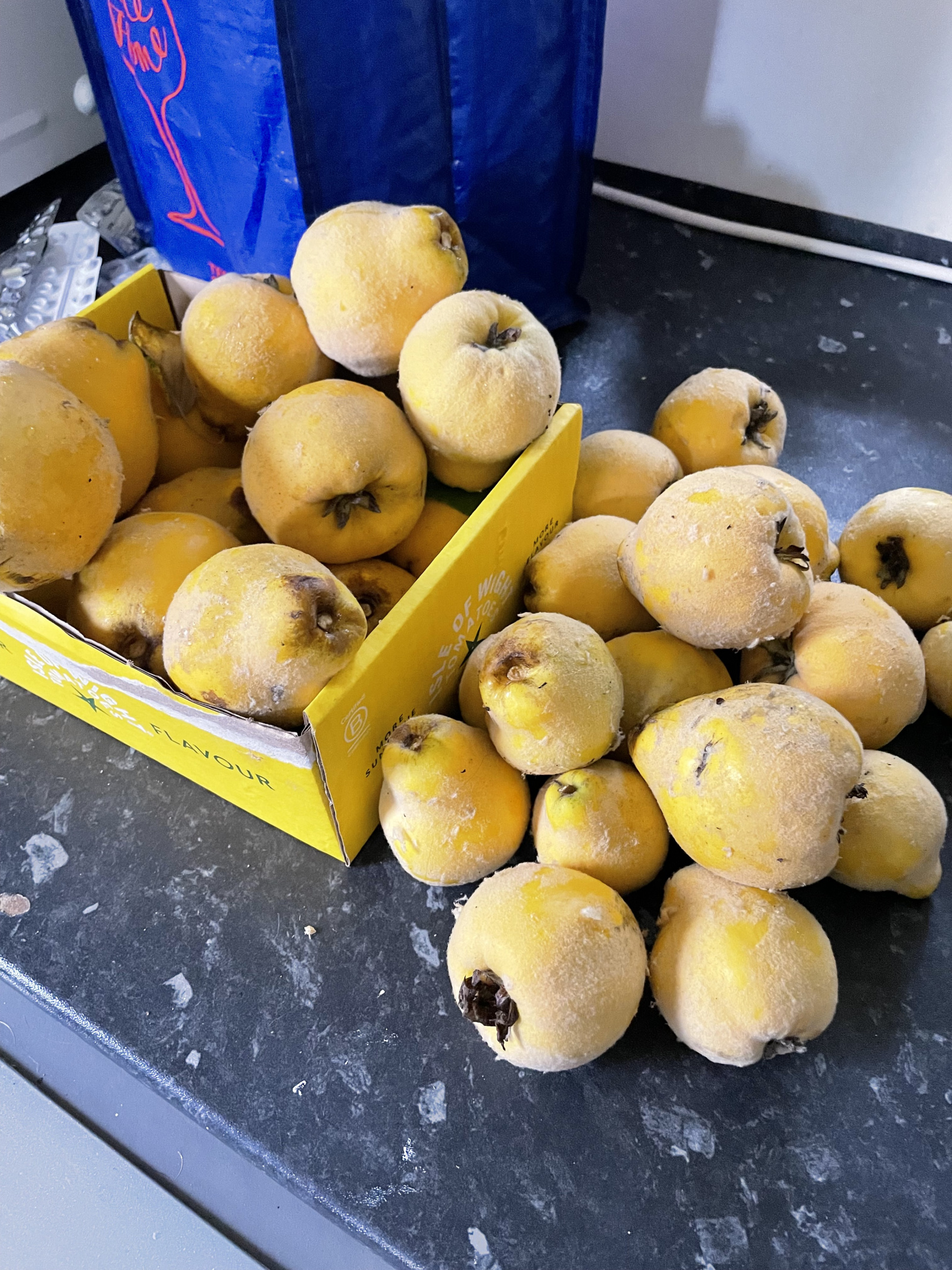 I have decluttered three builders bags of leaves from the footpath outside our house. I am not sure how we get so many. The trees are all along our road but most of them seemed to be outside our house. Anyways counting our blessings because i have bagged them up to make leaf mould. Its great stuff. We will get another couple of bags from our lawns.I also harvested most of the rest of our quinces. Its our first year with a proper harvest. We are in a very dry area with heavy clay soil and marauding pigeons so we get practically no fruit from anything else but we have been eating the windfalls a few at a time for weeks and today i got all but one. They are relatively small about the size of an eating apple but they taste nice. I have them stewed in greek yoghurt or in crumble or Delia’s cranberry mincemeat. I have found they cook really quickly. I am not sure if its the size or perhaps a lack of water. I find potatoes go mushy if they go short of water so perhaps its the same.