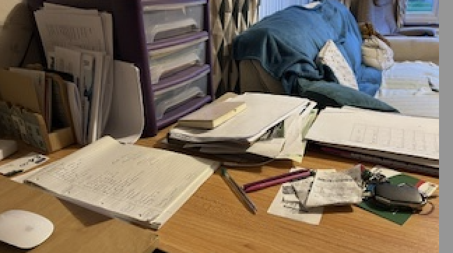 Before and after desk picture. Still a few frogs to do but no longer just a heap. The note pad is where I record my decluttering.
