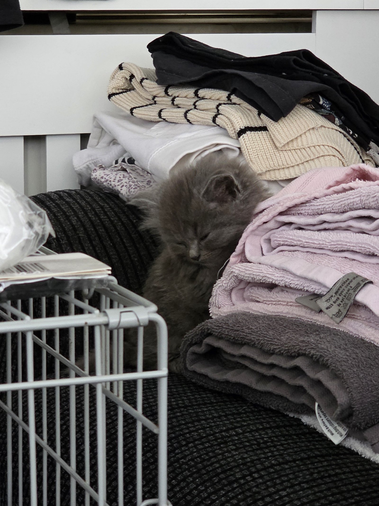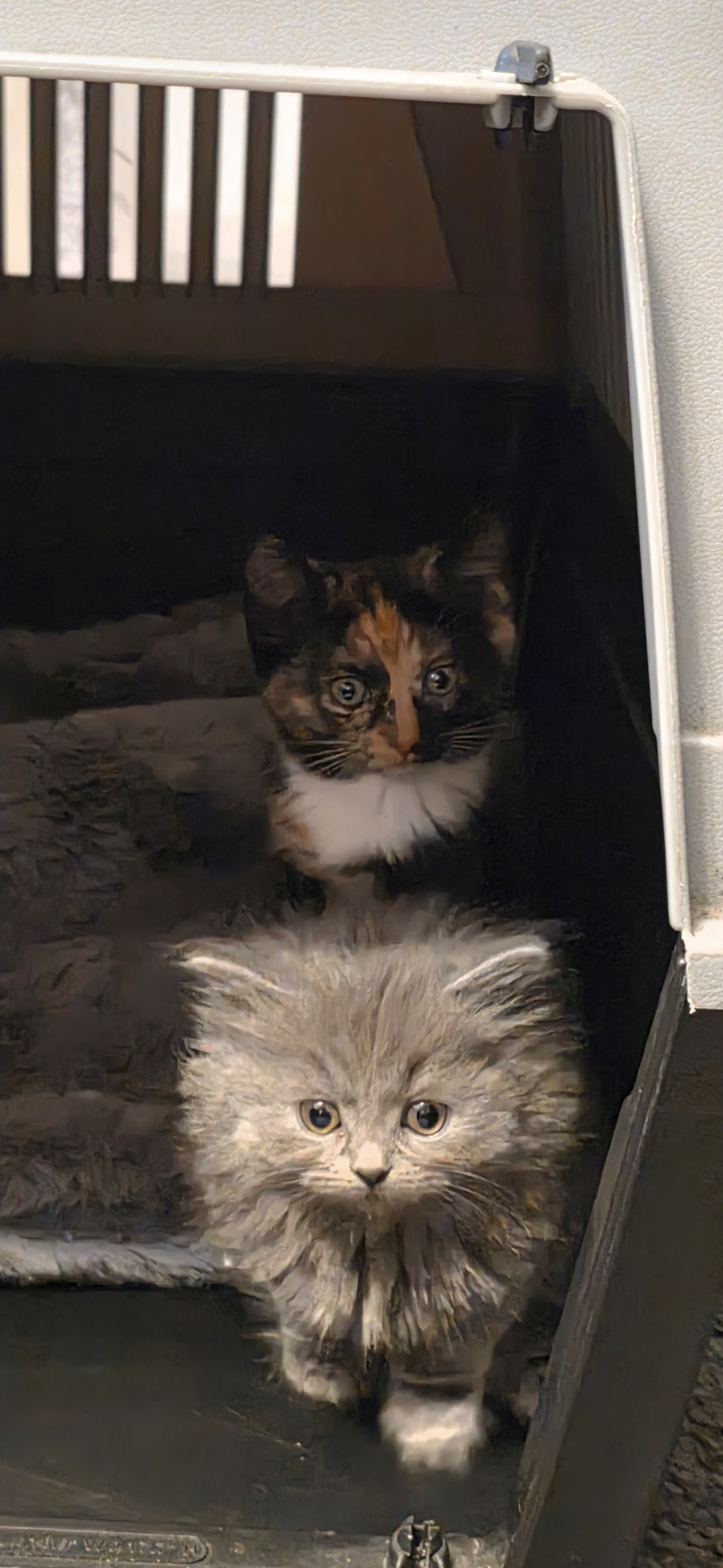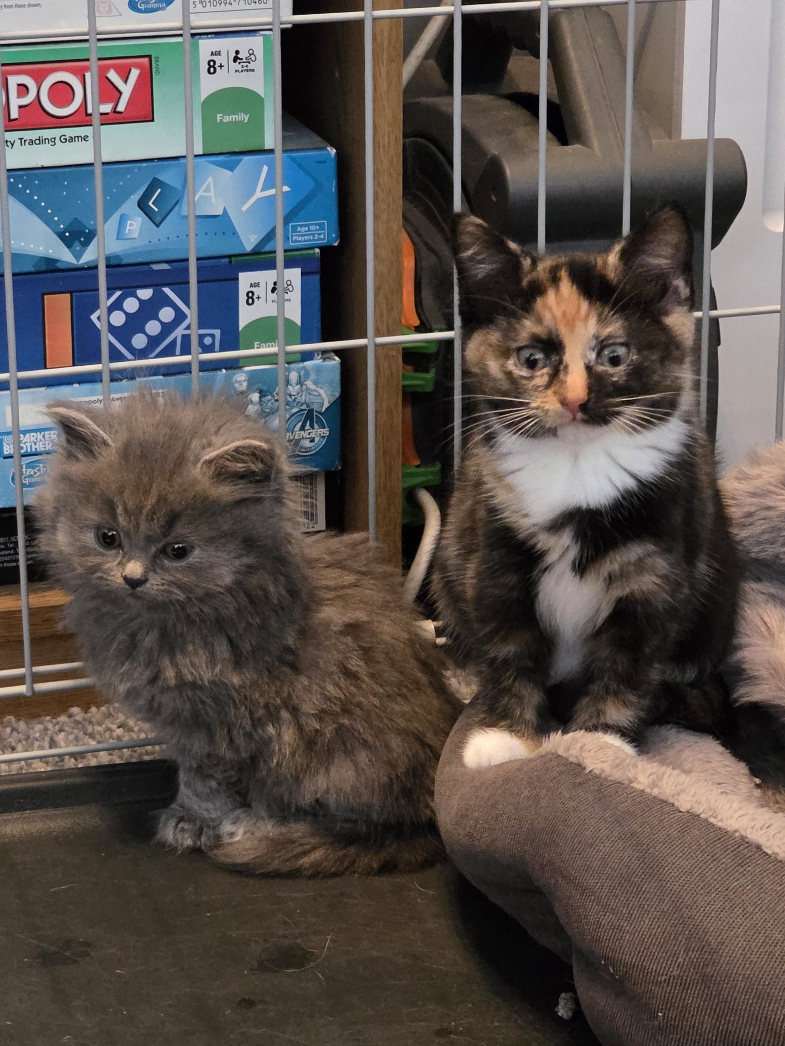 Kitten pics on below. No axolotl pictures yet. It's all payed for but she's got to set the tak up before it can come home, between 2-4 weeks to 'cycle' and she only set it up Thursday. Shes getting very impatient and wants it to be ready now. Both kittens have taken to sleeping in the washing so id be mean putting it away 🤣. Tge crate was for the first few nights as we weren't sure how the dogs would be but they're absolutely fine and just want to play