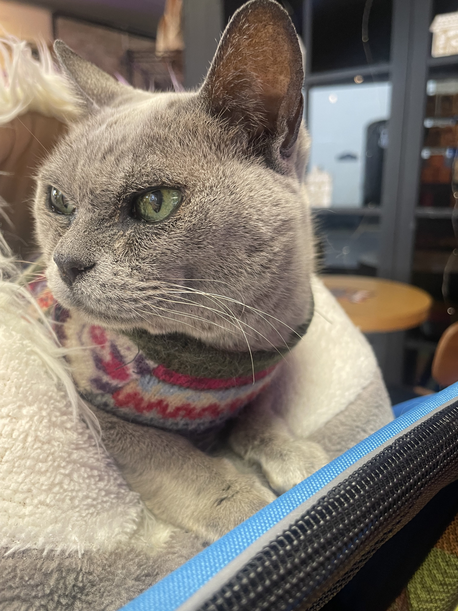Oh and I decluttered my flip flops. In early 2014 i bought them for €2.50. Last week we were camping in Southwold and I wore them to the shower block. They were quite mucky from the mud so picked them up to wash them. I noticed the bit that goes between the toes was coming out. I thought I should be careful walking back. I got about two steps from the shower block and the right one fell apart. The next step the left one fell apart. What are the chances of them both breaking at exactly the same time. I walked back looking very strange trying to get to the campervan without injuring myself and chucked them away. Not done too badly considering they are 11 years old.Completely unrelated picture of my cat wearing her upcycled Laura Ashley jumper enjoying a rest in a cafe. She sits on top of our cat stroller because she gets grumpy with the other cats.