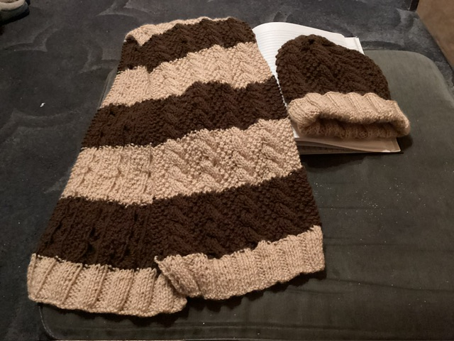 Sunday started bright & sunny but with a noticeable drop in temperature from yesterday - high 8°C, low 4°C DH filled the bird feeders & has just ordered a little present for my DSis. I have finished knitting the scarf & the picture shows it with the complementary hat.