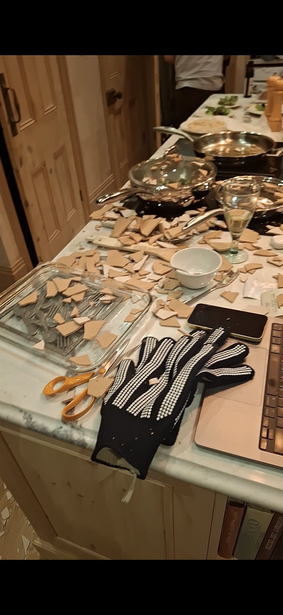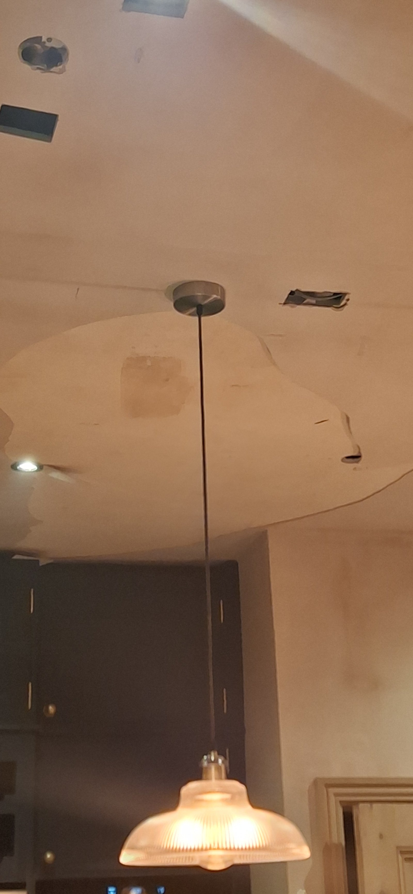 I went to stay with youngest & his wife in the home they're renovating, and after a smoked salmon & scrambled egg brunch and a walk in Sefton Park, Meg began prepping our meal (scallops & black pudding, roast beef & all the trimmings and Yule log) while Chris and I set the table & sorted drinks etc.Meg said to us "what's that fizzing noise?", stepped away and the ceiling above the hob & ovens fell down as we watched! 😳