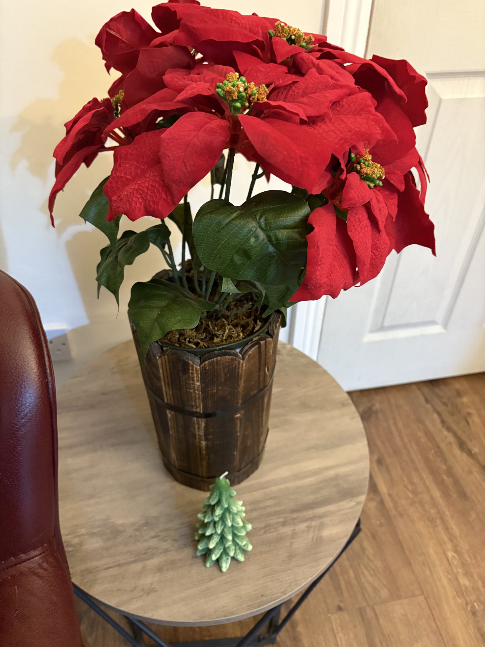 It wasn’t a charity shop, but I went to a Christmas fayre today and bought a Christmas tree candle for 50p and an artificial poinsettia for £3.