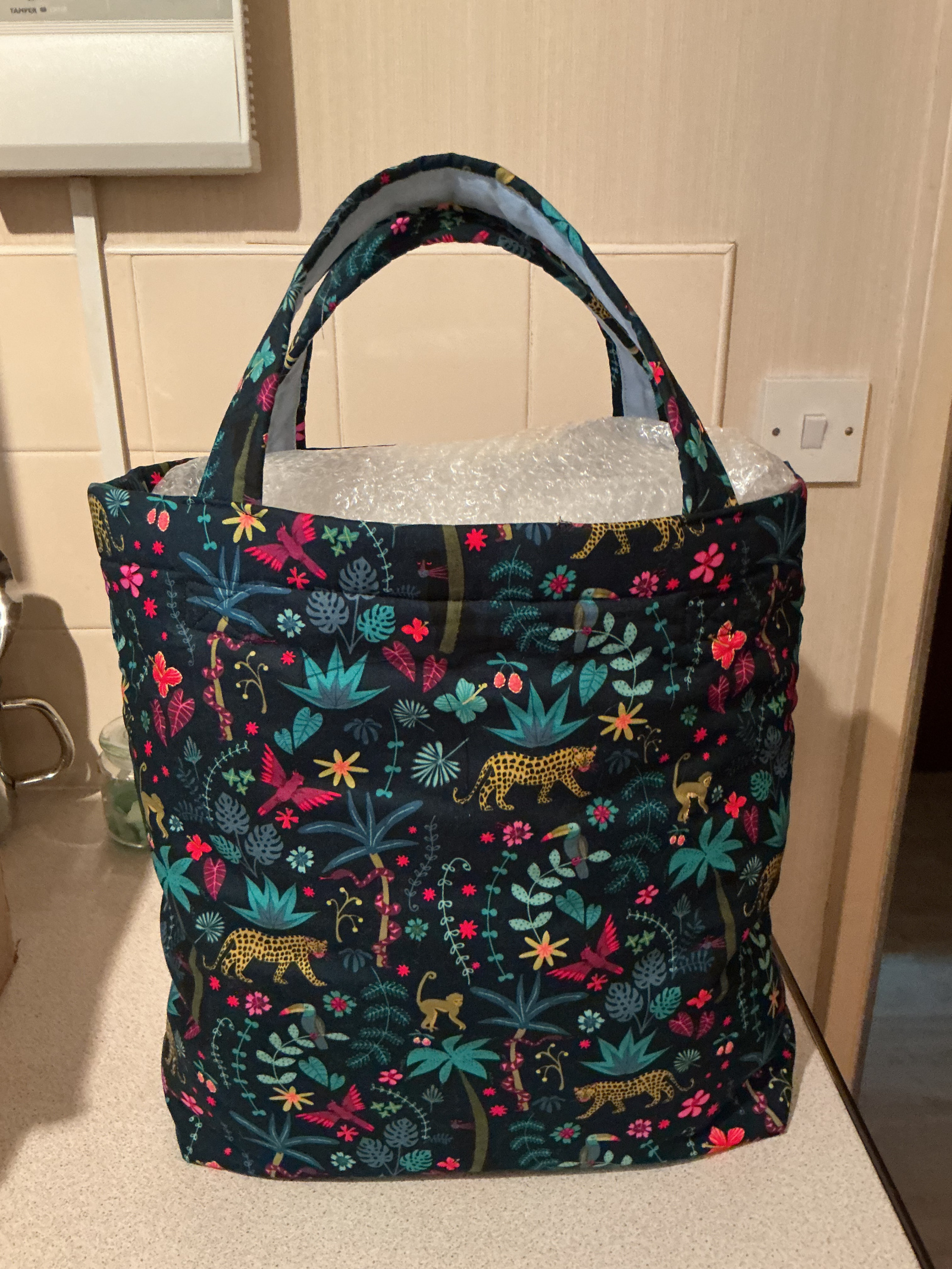Bargains have been thin on the ground lately. Except this weekend I picked up a Country Casuals linen summer dress(!), just as the weather turns cold, from Sue Ryder shop for £4.95. Also got a fine wool jumper from the Yorkshire Cancer shop for £1, (they had a clearance event) both in Northallerton. From the Bedale car boot got a small magnifying glass, perfect for handbag for 50p. Also was given some wonderful new fabrics by a Freecycler. Have made a ‘bag for life’ from one wonderful jungle print, now got to do something with an ‘Elvis in Las Vegas ‘ print and one ‘Spectacles’ print 😛