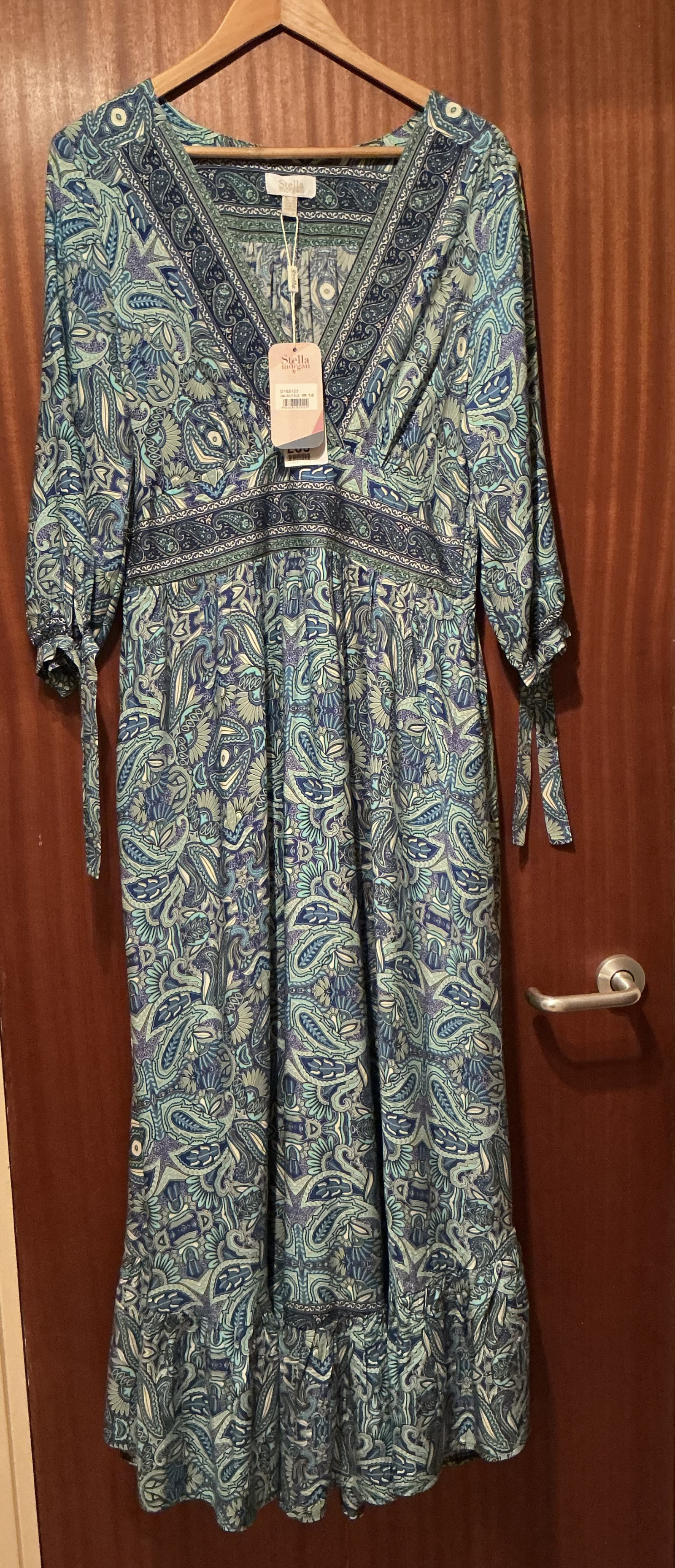 Miró said:I have at least 4 full sets of china and lots of crystal glasses and dishes. Some inherited, some were wedding presents and some from when I had a job with a hefty 50% off staff discount at a very posh shop. Yet I only ever use my boring plain white Ikea 365 stuff…why? I dunno!Today’s trip to Otley was lovely….warm sunny day, loads of fluffy white clouds, red kite swooping overhead, stunning views over the valley with the river in full spate, fields full of cows, sheep, a few deer and the odd donkey and the trees starting their autumnal colour changes. Even managed to find a nice buy in the St Gemma’s 99p shop….only it was £2.99 cos it was on the ‘designer’ rail.Ooops, giant pic syndrome again! Bit daft buying summery frocks at this time of year but I just loved the colours! By Stella Morgan and price tag still attached £50.