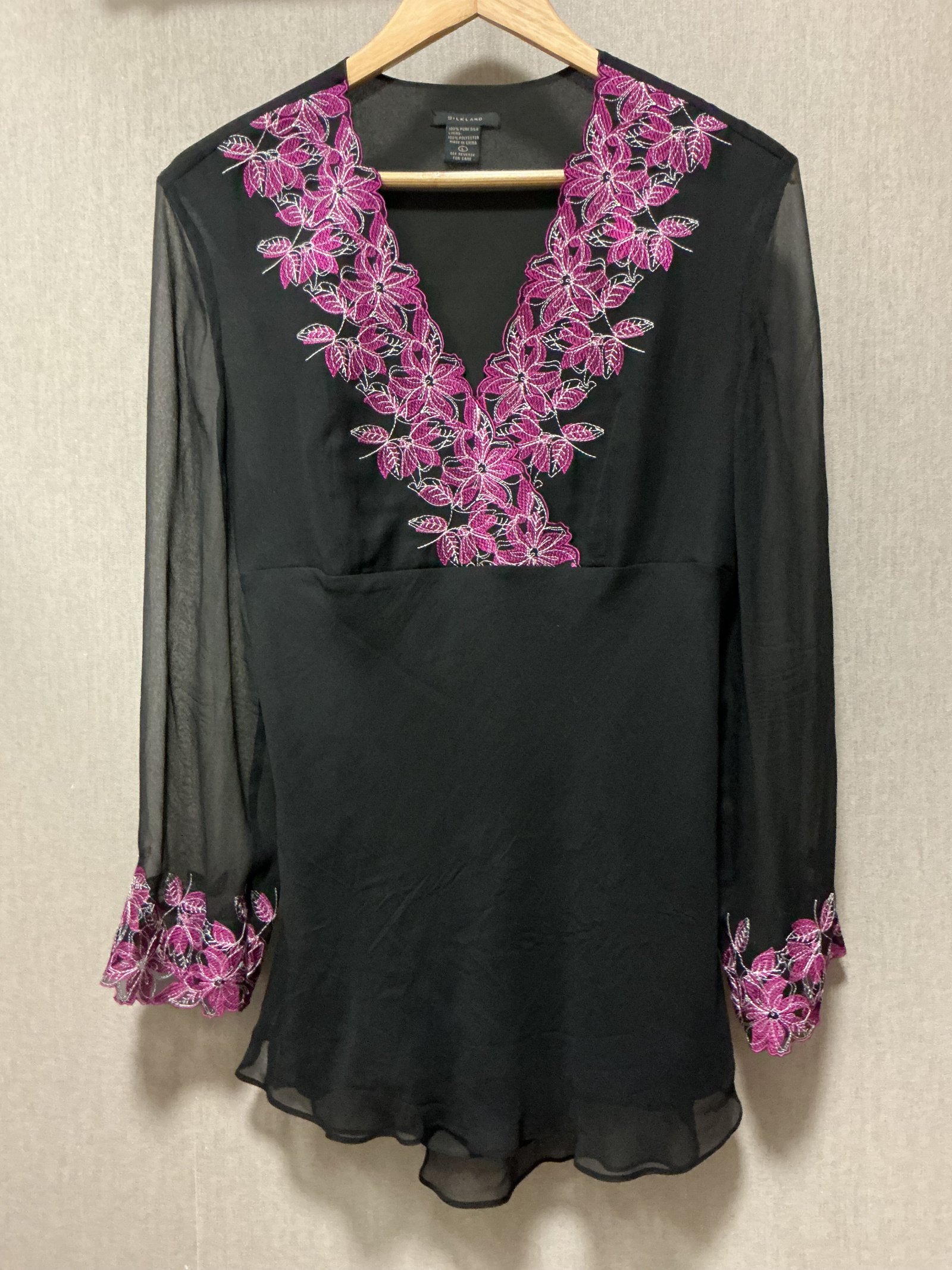 A quick dash round the 99p shop today….picked up a pure silk top, black silk georgette with pink embroidery by Silkland. Plan on wearing it with a pair of black slimfit ankle grazer trousers. Not sure about footwear???