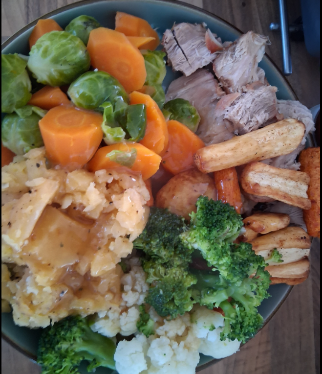 Tea roast pork and loads veg, gravy 4 syns, i tried the yorkshires but used little foil things i did give it a spray but wasn't enough, they did rise, but didn't eat them as didn't fancy eating the foil tin 🤣🤣, little more pratice