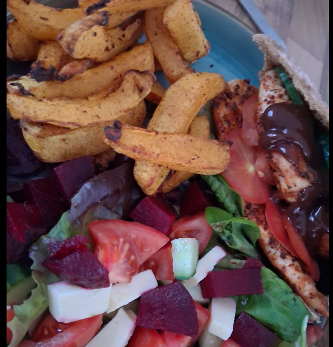 Tea, hexa and b, I used jd bbq seasoning on the chicken, 1 syn bbq sauce , bns and salad.