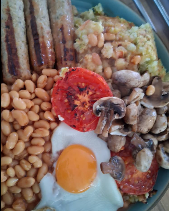 Bubble and squeak, LM dups sausages, tomato, baked beans ,mushroom and egg