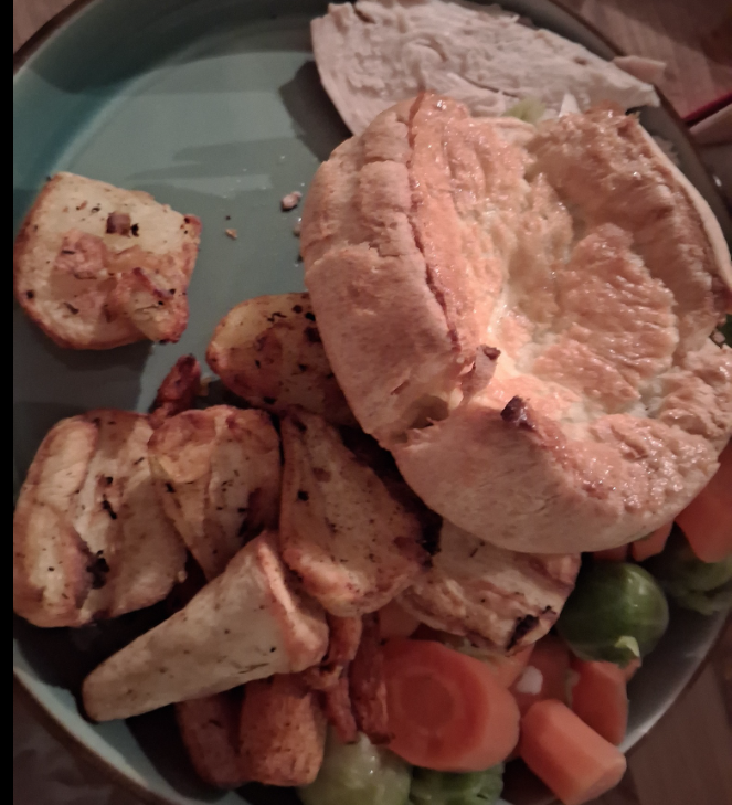 Roast chicken, veg, Yorkie 2 syns, and made a syn free cauli cheese with 2 hexa, i had about 1/3, could of done with being a bit more crispy but was nice.