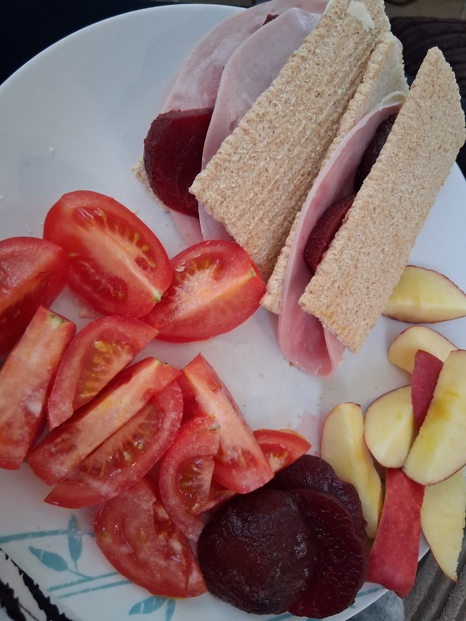 Lunch i had 4 ryvita crackers with ham and beetroot, tomato , seafood sticks,
