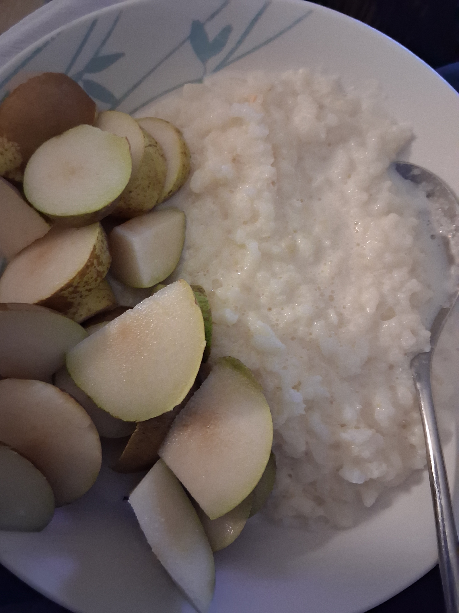 Made a rice pudding for pudding, hexa, served with chopped pear, was lush