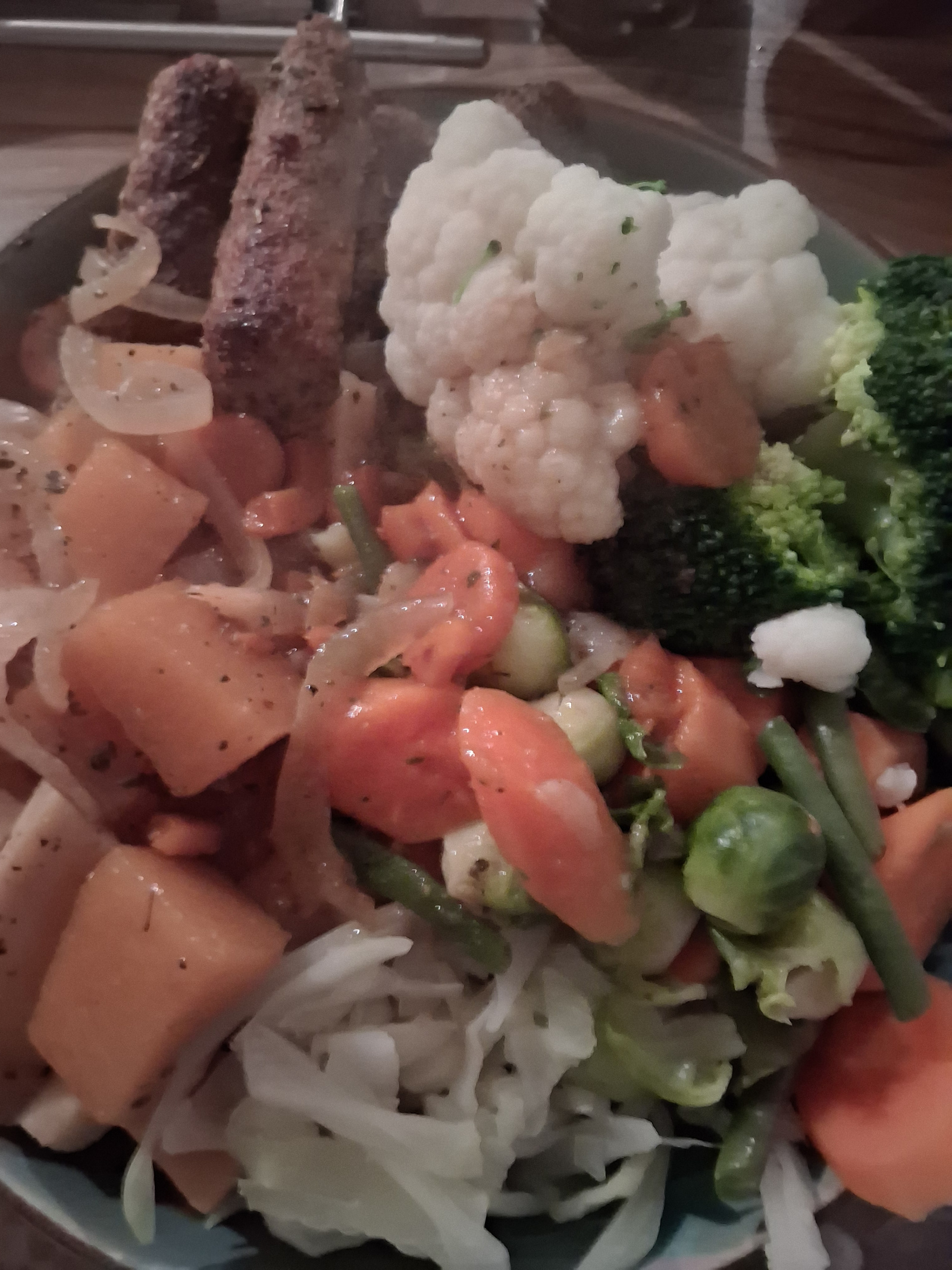 Sausage casserole for tea with LM sausages so free, tonnes of veg.