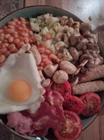 Tea bubble and squeak, LM sausages, bacon, beans, cooked toms, mushrooms, egg, pita hexb
