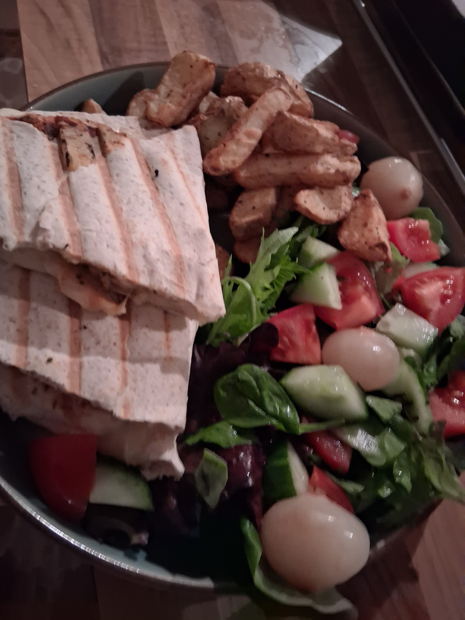 D- cold gammon (P), stir fried veg (S), SW chips (F)