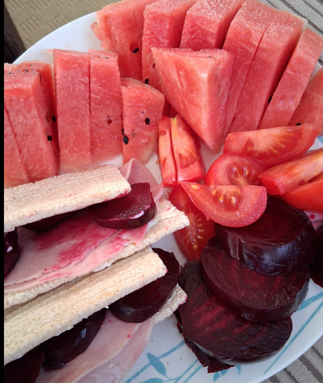 Had lunch, half hexb and a, ham, beetroot, tomato and watermelon.