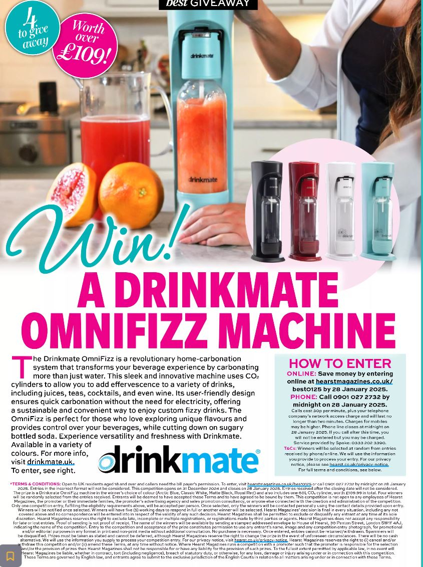The prize is a Drinkmate OmniFizz machine in the winner’s choice of colour (Arctic Blue, Classic White, Matte Black, Royal Red) and also includes one 60L CO2 cylinder, worth £109.99 in total. Four winners will be randomly selected from the entries received.