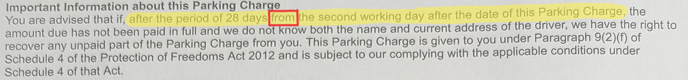 The wording on the back of the NtK attempts to transfer liability to the keeper one day early by stating that 28-day period starts “from the second working day after the date of this Parking Charge", rather than the day after the second working day.