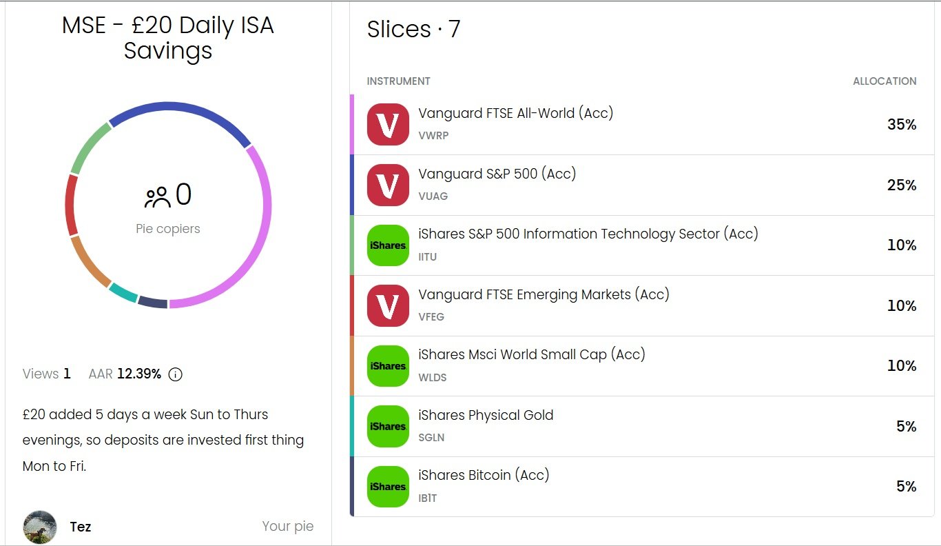I won't go into too much detail about the 7 investment slices in my pie, but they are all Accumulating (acc) which means dividends are reinvested into the fund boosting growth more quickly. If you fancy feel free to take a look yourself and let me know what you think : https://www.trading212.com/pies/ltzw4Wew651jgq4oGrepyrZJB4TgC