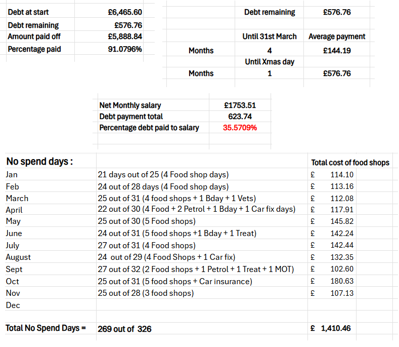 I quick look at the figures above. I have now got the debt to below £600 with around 1 month left of payments until Xmas day, my target to be debt free. I have now paid off over 91% of my original debt.