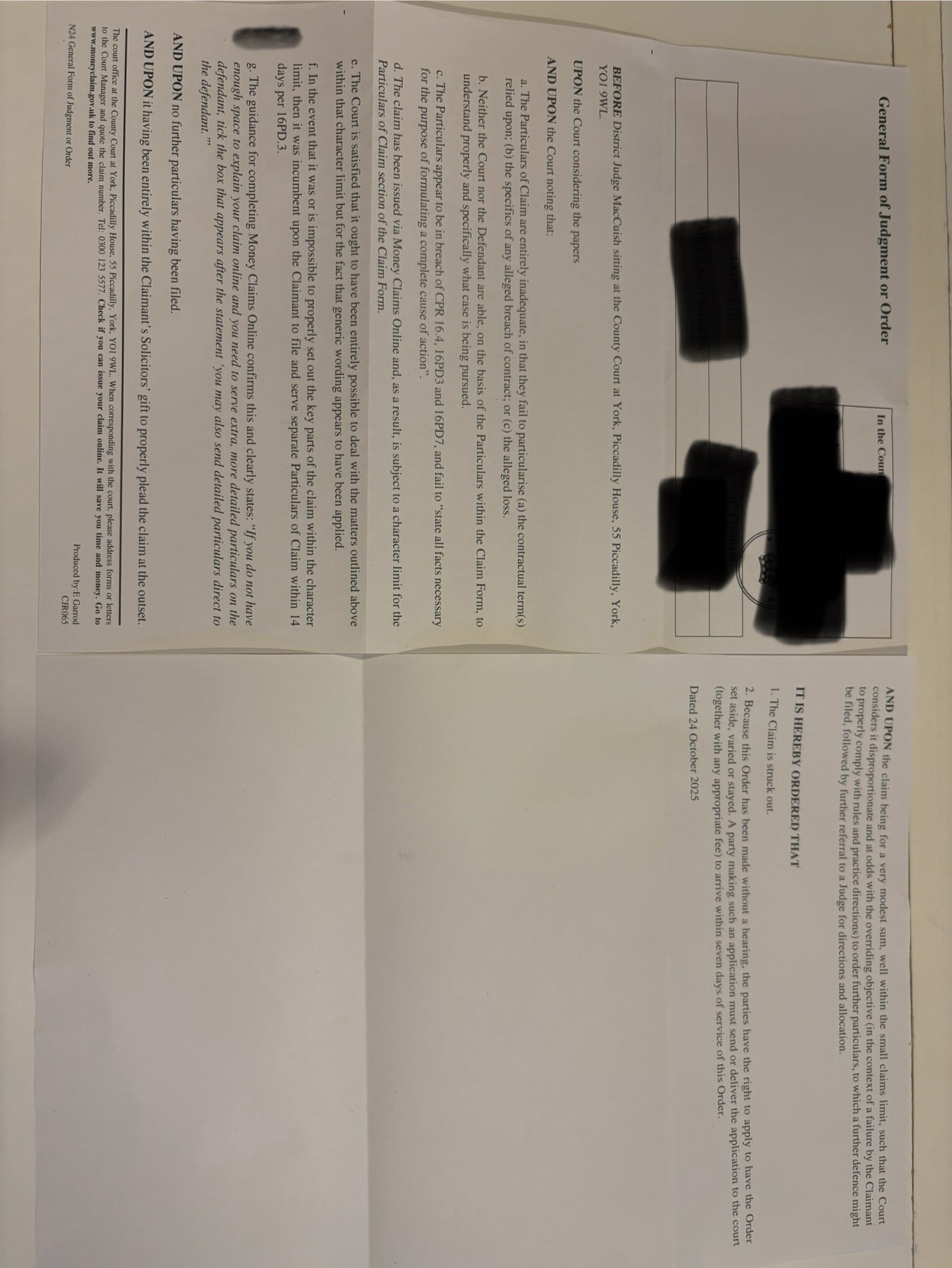 I assume that this strike out was the UKCPS , MOORSIDE LEGAL claim with generic POC and the alleged breach not pleaded at all ? Just goes to show how bad these bulk litigation lawyers can be at not doing a proper bespoke job on behalf of their clients, probably due to an inadequate copy and paste POC template