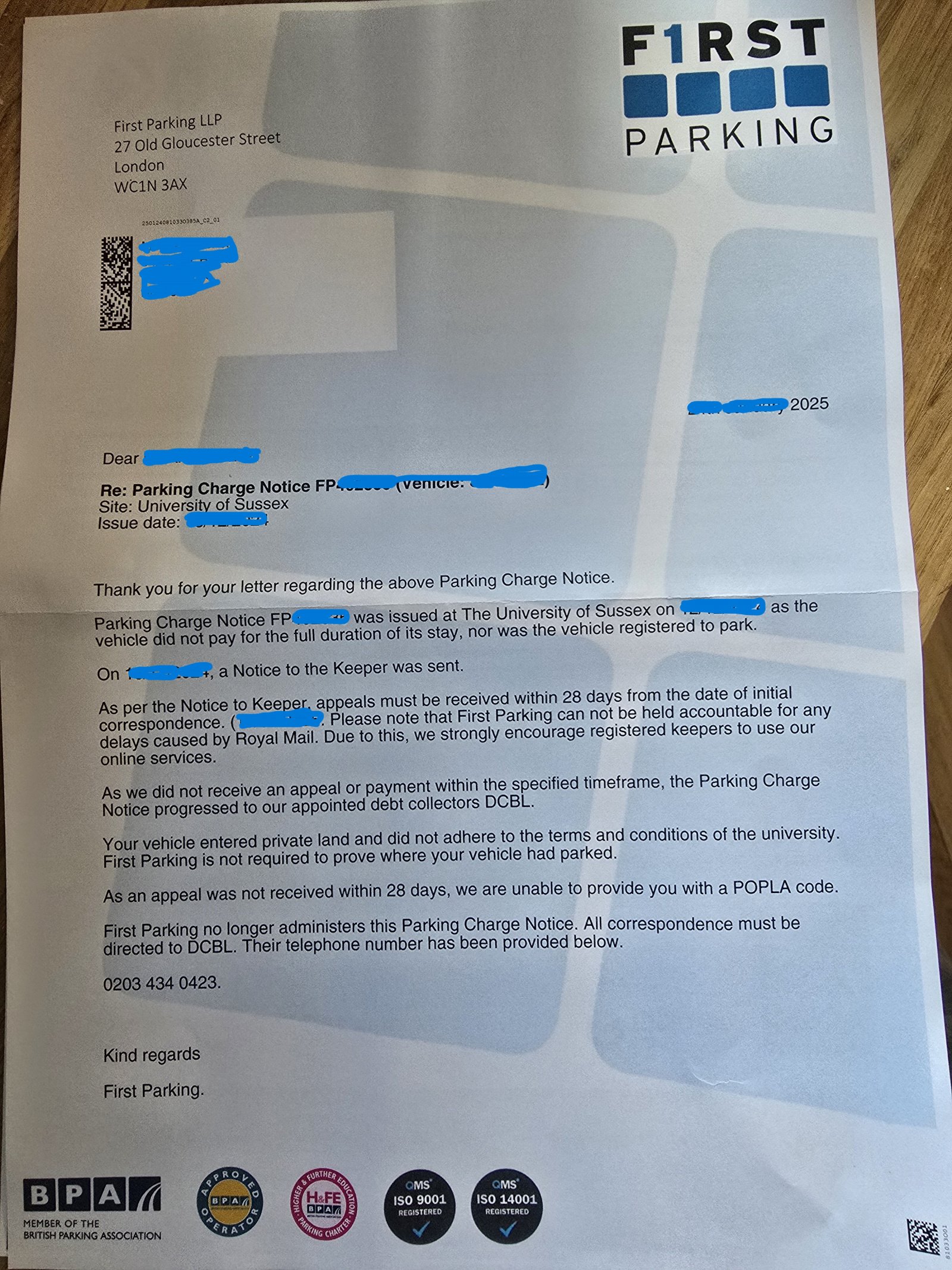- F1rst Parking sent me a final letter stating they refuse to send me a POPLA code as they received the letter beyond the 28 days, and have passed the charge over to debt collectors