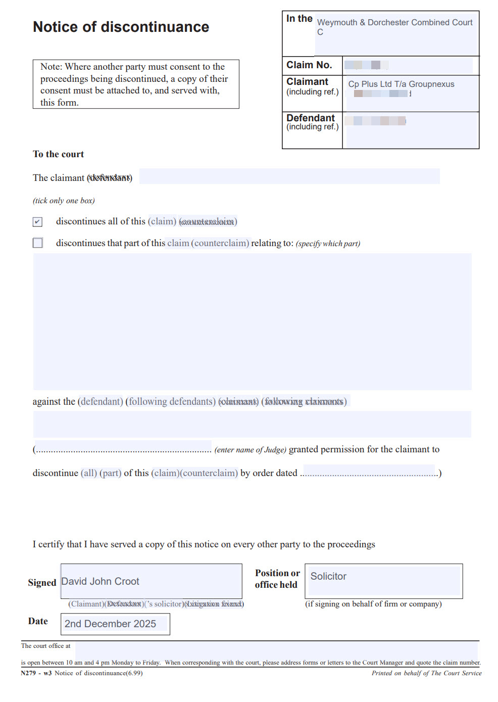 Well what a 24 hours,I've been spending time compiling and finalising the statements and evidence for the submission deadline which is Tomorrow (3/12/2025) at 1600h and getting ready to drop it into the courts email inbox with an hour or so to go when today my partner forwards me an email from DCB Legal ..... Discontinuing the case at the 11th hour ... So that's nice as it gave me a free evening for a feet up and a beer.I will post the discontinuation form in due course, want to blank parts out and also my partner wants to ensure it's all done and dusted first.But thanks to all you guys and this forum, it's been invaluable in both walking me through the process and also with the information to provide.1 last question though, can I and should I now be claiming costs for all the paperwork I e been doing up to this point?4