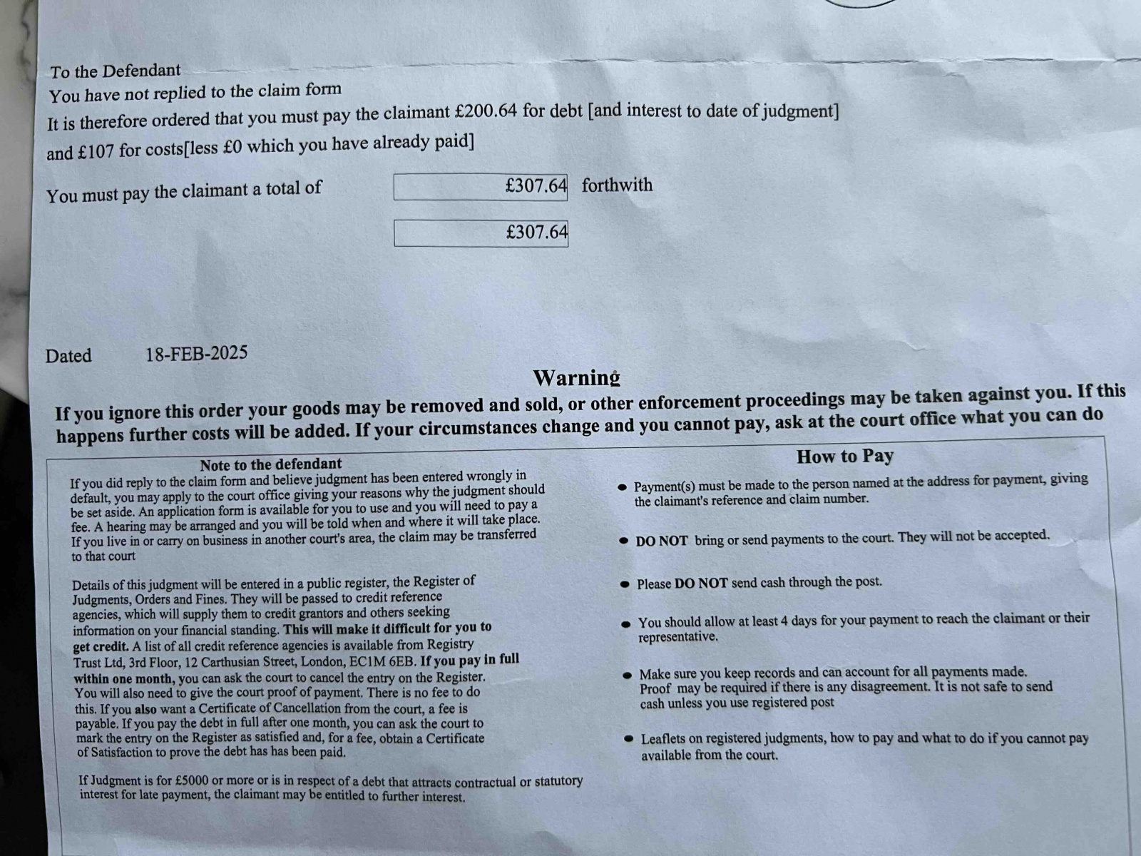 Sorry quick update as I'm learning, it looks like a CCJ has been added against me for this. I'm so upset.0