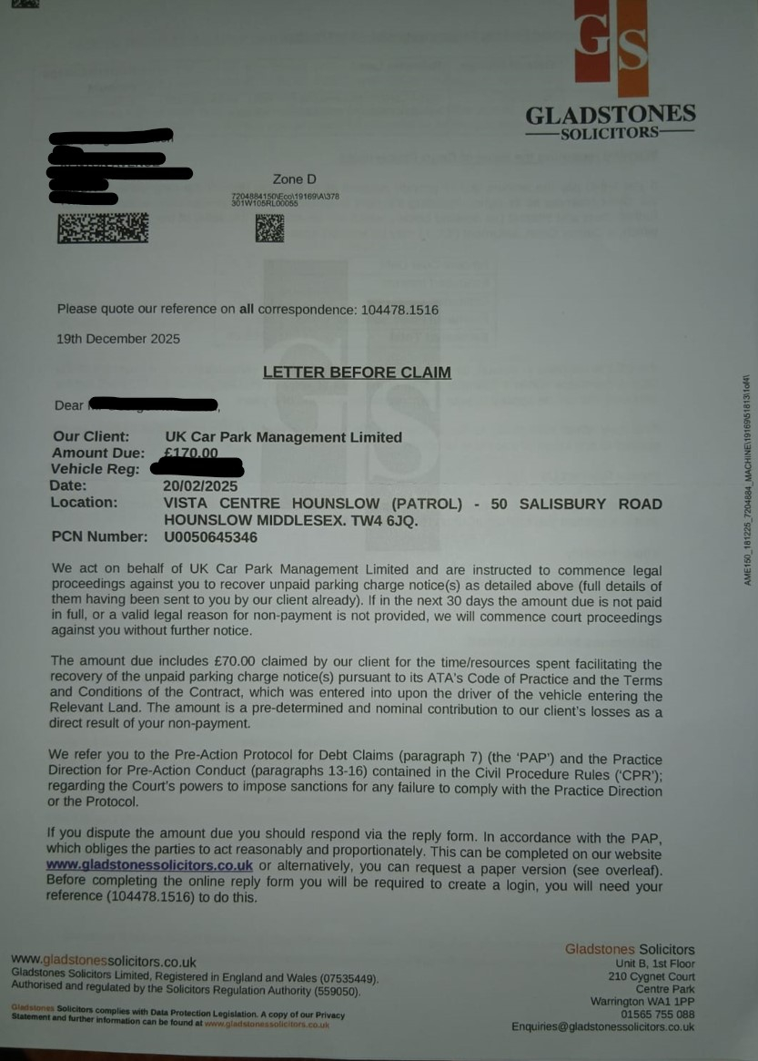 Dear Sirs,Your Ref XXXXProposed Legal ProceedingsClaimant - UK Car park management limitedI refer to your letter of claim dated XXXX. The alleged debt is disputed and any court proceedings will be defended.Your is addressed to my father and was registered keeper of the vehicle, he is 81 years old and therefore I request you transfer liability in this case to myself, XXXX XXXXXXX of <Address>.On the day in question a ticket was purchased, and the vehicle parked. No clear lines were marked on the ground, nor a clear indication it was a restricted parking bay. The vehicle was parked next to another already parked vehicle - there were no clear signs immediately in front of the bay.The Civil Procedure Rules 1998, Pre-Action Conduct and Protocols (Part 3), state:3. Before commencing proceedings, the court will expect the parties to have exchanged sufficient information to understand each other’s position, make decisions about how to proceed and support the efficient management of those proceedings.Part 6 states:Steps before issuing a claim at courtThe parties should exchange correspondence and information to comply with the objectives in paragraph3, bearing in mind that compliance should be proportionate. The steps will usually include —(c) the parties disclosing key documents relevant to the issues in dispute.You refer to a contract, yet you fail to include a copy of the contract (a key document), as well as fail to state the contractual nature of the breach you allege.Therefore, as your templated letter is not sufficient to adhere to the PACPs, I require the following:1. A copy of the contract (or contracts) you allege exists between your client and the driver, in the form of an actual photograph of the sign you contend was at the location on the material date.2. The exact wording of the clause (or clauses) of the terms and conditions of the contract(s) which is (are) relied upon that you allege to have been breached.I look forward to your response.0 -